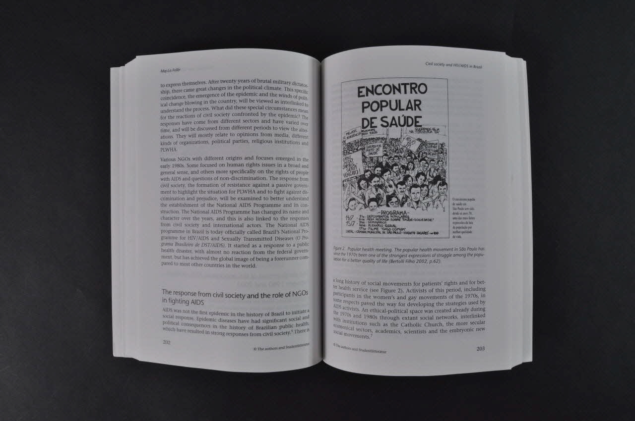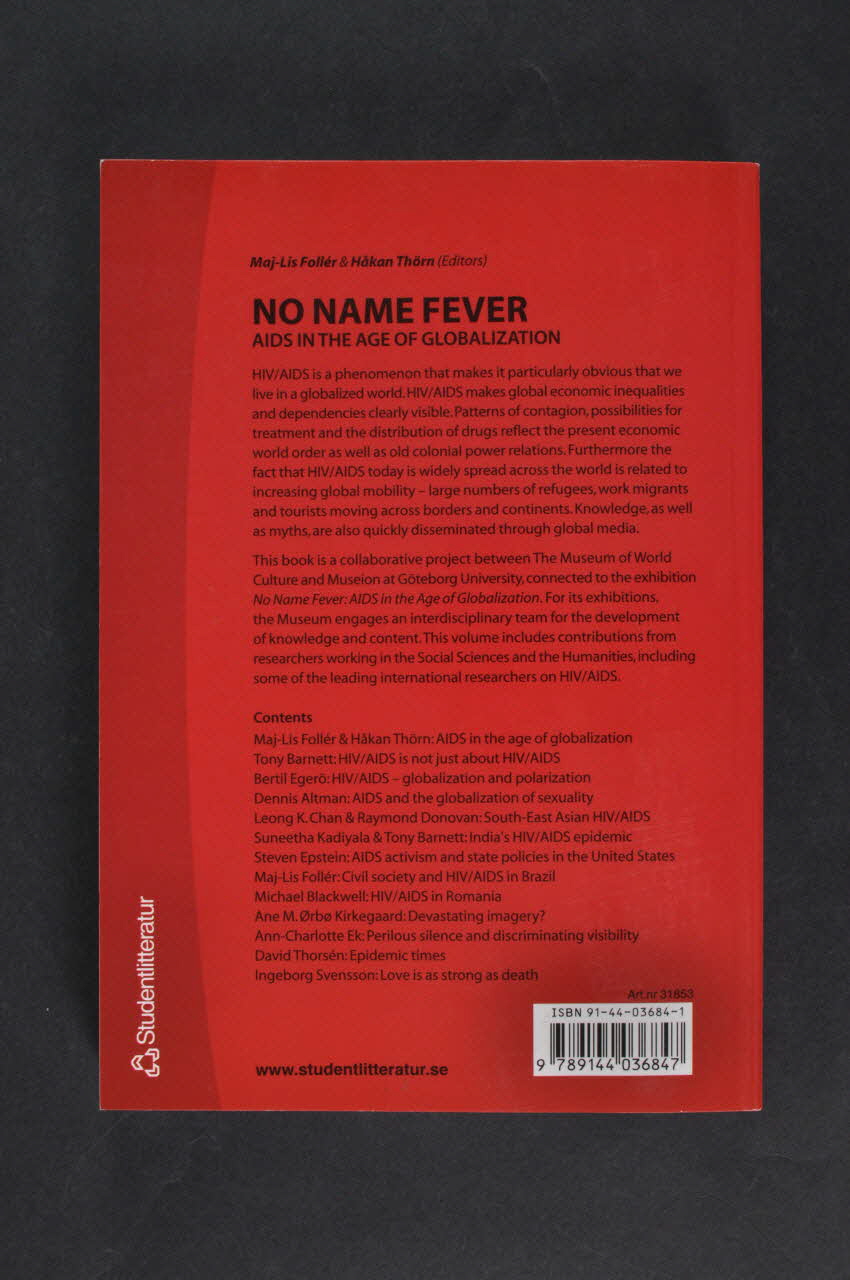 Livre en anglais de 368 pages à couverture souple. Fond rouge avec motif de réseau de ligne surmonté du titre "No Name Fever - AIDS in the age of globalization" (Fièvre sans nom. Le sida à l'âge de la mondialisation) et des éditeurs scientifiques Maj-Lis Follér / Hakan Thörn (Eds.). Dans la partie inférieure, verticalement le long du dos "Studenlitteratur", puis horizontalement Göteborg University. et Världskulturmuseet (Musée des cultures du monde). Quatrième de couverture avec longue présentaion de l'ouvrage et des auteurs.