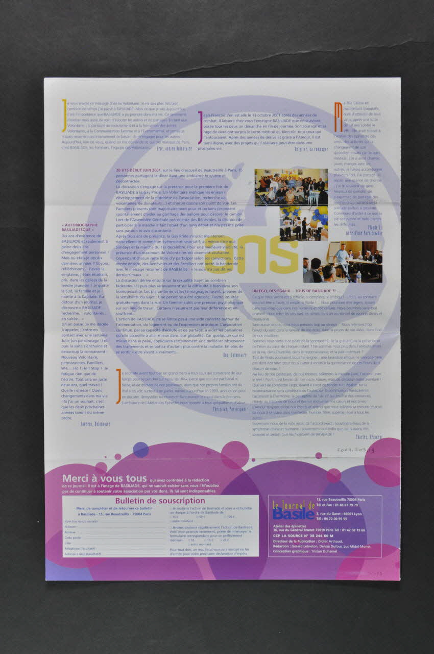 p.1 En haut : en caractères jaunes, puis bleus : "Le journal de / Basile". Et, en petits caractères blancs sur bandeau bleu :"Trimestriel de l'association Basiliade. Septembre 2003, n°26".