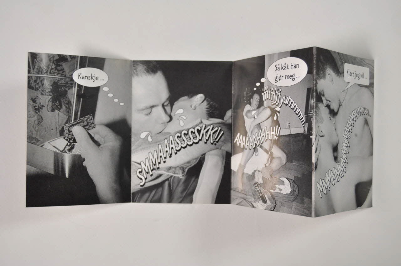 Le recto du dépliant présente une photographie noir et blanc, d'un homme souriant entrain de porter un verre à sa bouche. Une inscription est imprimée en lettres fantaisie vertes le long de la bordure supérieure, et une bulle (de style BD) est imprimée dans la partie inférieure. De forme ovale, son fond est blanc et elle est surimprimée d'une inscription en vert. Au verso, la composition est bipartite: les deux tiers supérieurs sont colorés en vert surimprimés d'inscriptions noires sur une colonne. Le tiers restant est en blanc. Des inscriptions imprimées en lettres capitales vertes sont suivies d'inscriptions noires et accompagnées d'un logo noir représentant le ruban de la lutte contre le sida. A l'intérieur, le dépliant montre un roman-photo en noir et blanc en six scènes. Chaque page montre une photographie accompagnée de bulles de type BD pour les dialogues et onomatopées. On peut donc suivre l'histoire en images d'un couple homosexuel (masculin), de la rencontre à la relation sexuelle en passant par le moment de doute quand à la question du préservatif.Inscriptions