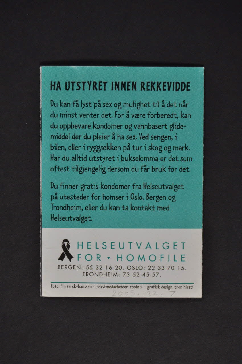 Texte recommandant l'usage de préservatifs et de lubrifiants que l'on peut trouver gratuits chez Helseutvalget.