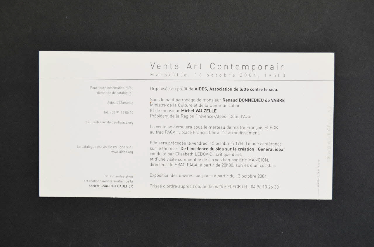 Invitation (inscription en haut), rectoOrganisée au profit de AIDES, Association de lutte contre le sida. / Sous le haut patronage de monsieur Renaud Donnedieu de Vabre / Ministre de la Culture et de la Communication / Et de monsieur Michel Vauzelle / Président de la Région Provence - Alpes- Côte d'Azur. / La vente se déroulera sous le marteau de maître François Fleck / au frac PACA (adresse) Elle sera précédée le vendredi 15 octobre à 19 h d'une conférence sur le thème : "De l'incidence du sida sur la création : General idea" conduite par Elizabeth Lebovici, critique d'art et d'une visite commentée de l'exposition par Eric Mangion, directeur du FRAC PACA, à partir de 20h30, suivies d'un cocktail. / Exposition des oeuvres sur place à partir du 13 octobre 2004..." (inscription en noir sur fond blanc), versoTitre