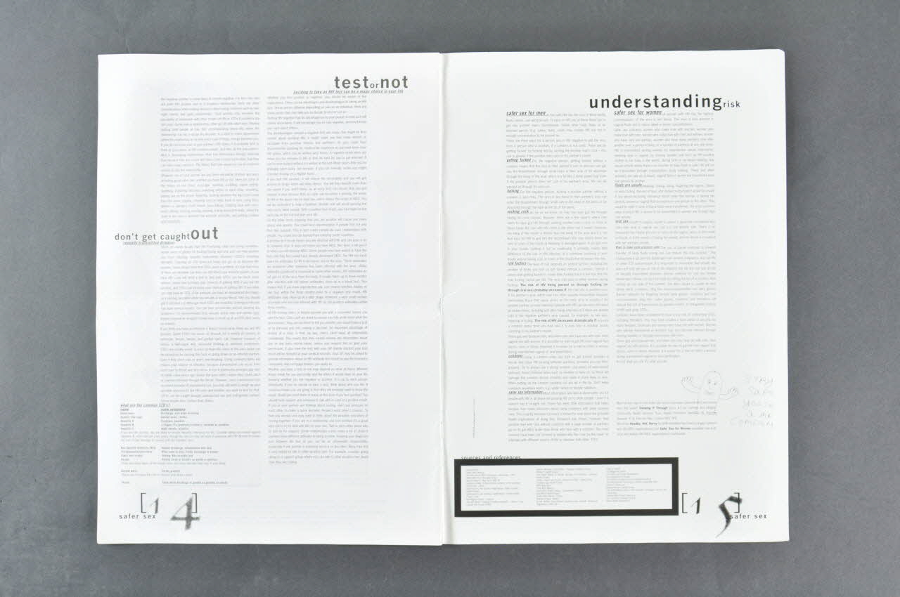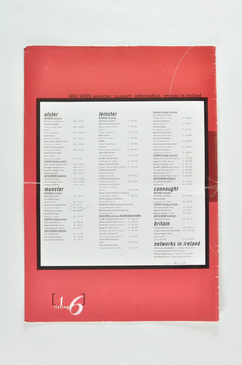 Brochure de format A3, constituée de quatorze pages blanches reliées par deux agrafes sous une couverture glacée à fond rouge. Au centre de celle-ci sont dessinés deux petits personnages se tenant par la main et les levant vers deux coeurs rouges, reliés par un trait à la page de dos qui présente les services d'aide liés au sida en Irlande. Sous les personnages, en caractères blancs figure le titre de la revue.