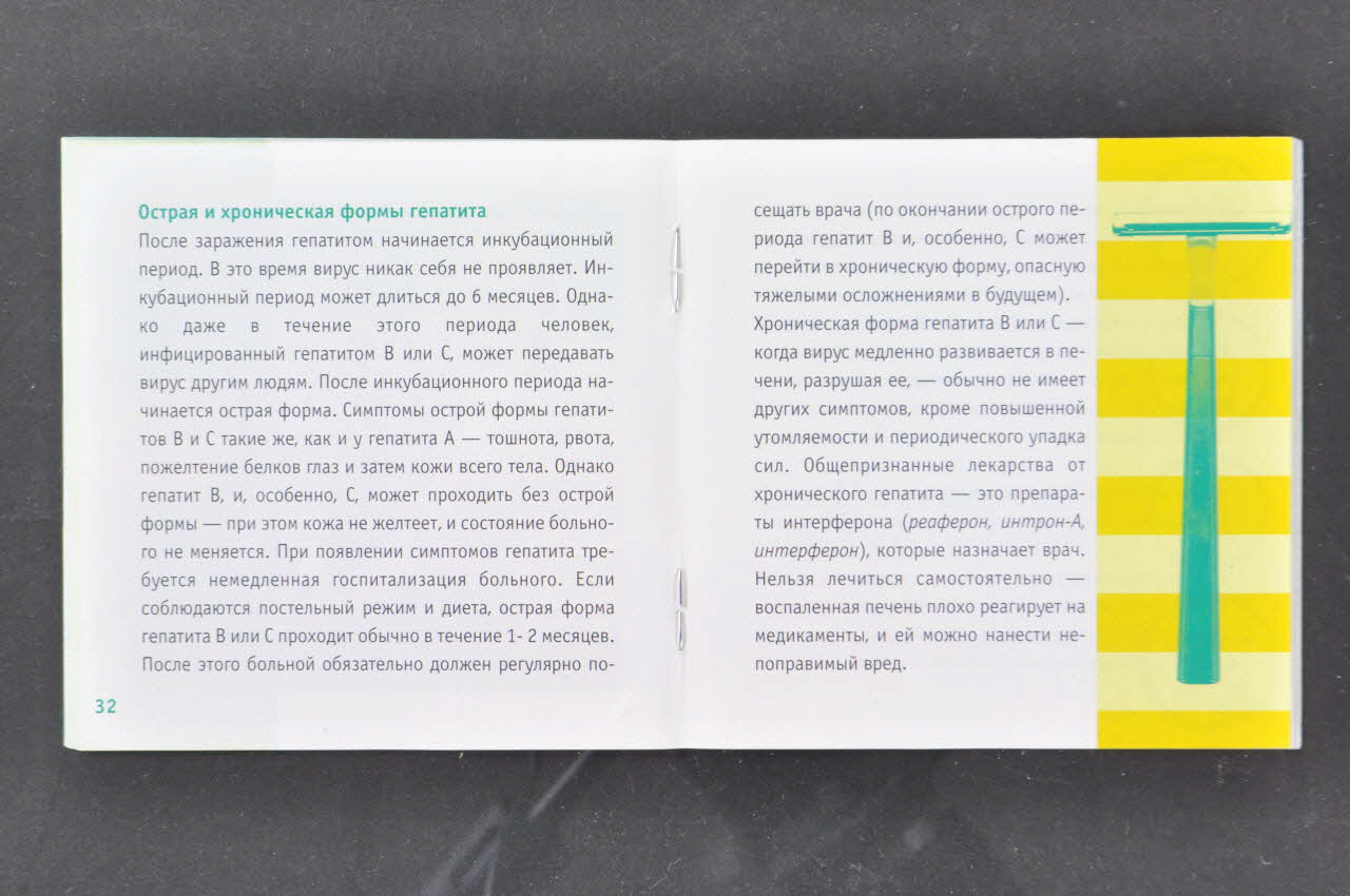 Elle contient des textes en russe et des photographies en couleur illustrant les conseils donnés : précautions sanitaires, premiers secours, etc. La première de couverture est noire avec un cadre vert et un rond noir au centre du bord droit ; l'arrière est vert avec un cadre noir.Décor