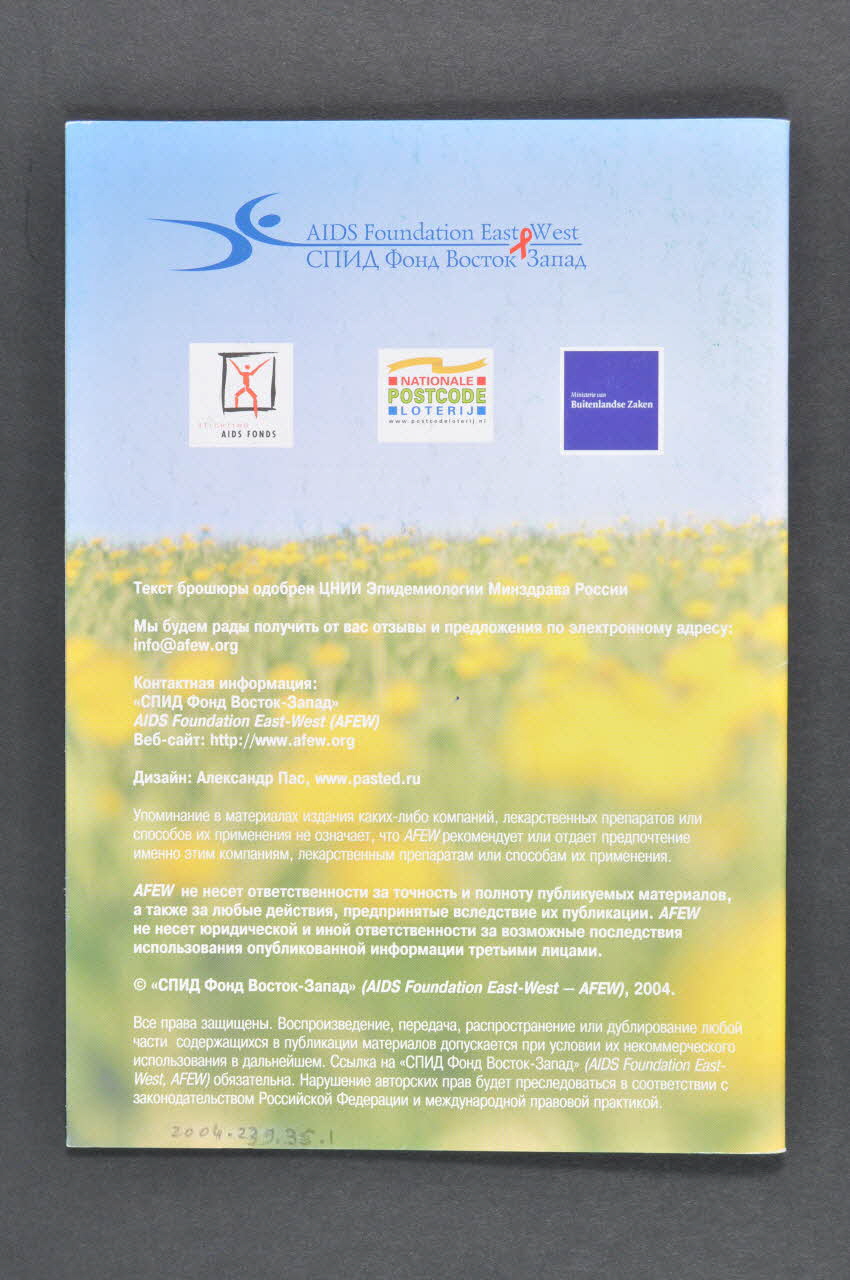 - AIDS Foundation East West // - Stichting // AIDS FONDS // - NATIONALE // POSTCODE // LOTERIJ // - Ministerie von // Buitenlandse Zaken (quatre logos présents en haut du dos du dépliant), versoDate