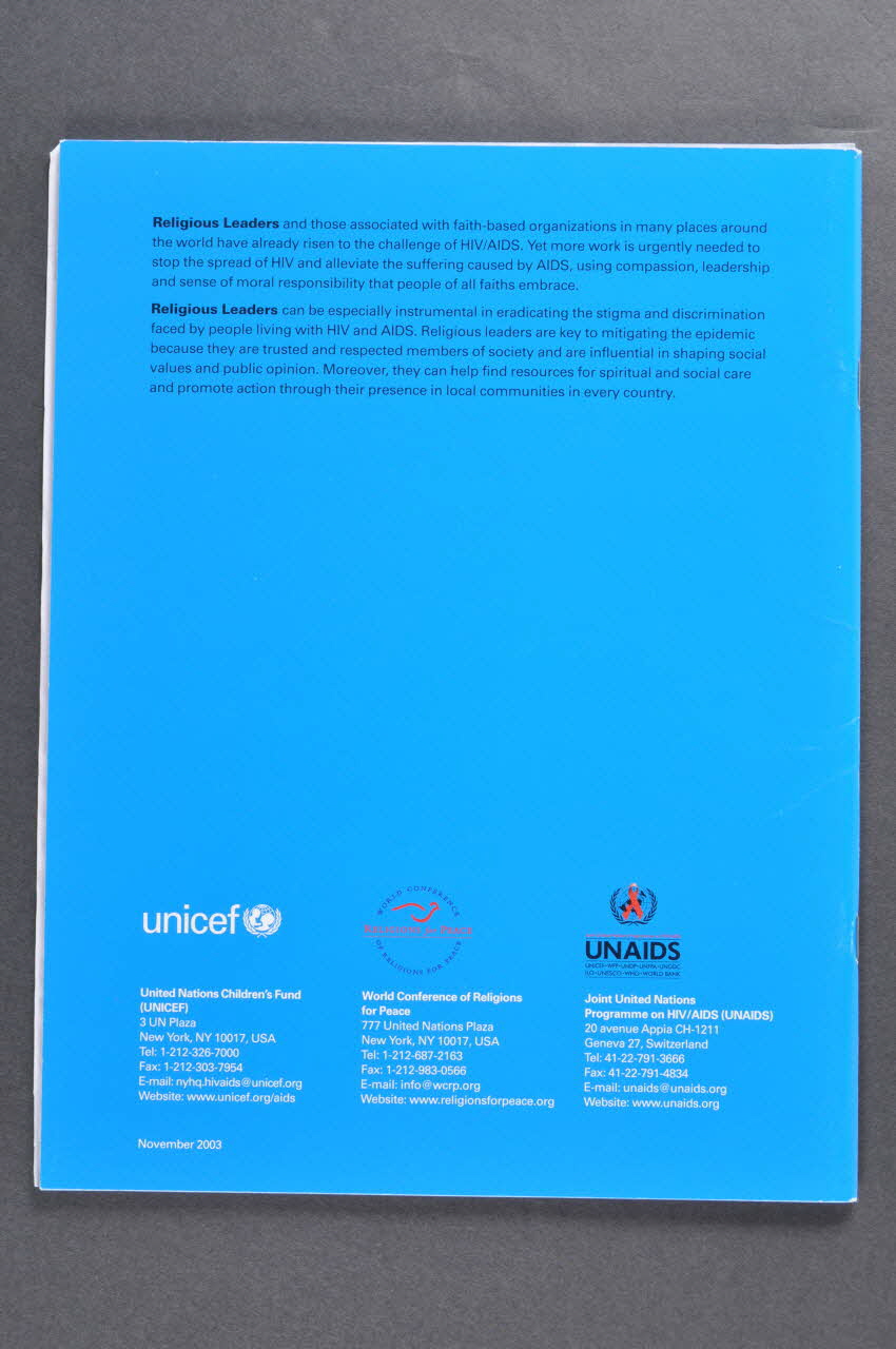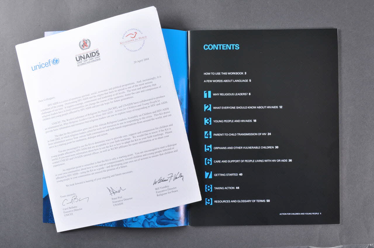 Une lettre imprimée sur une feuille de papier blanc A4 est glissée dans la brochure. Elle présente les logos de l'UNICEF, de l'UNAIDS et de Religion for Peace.