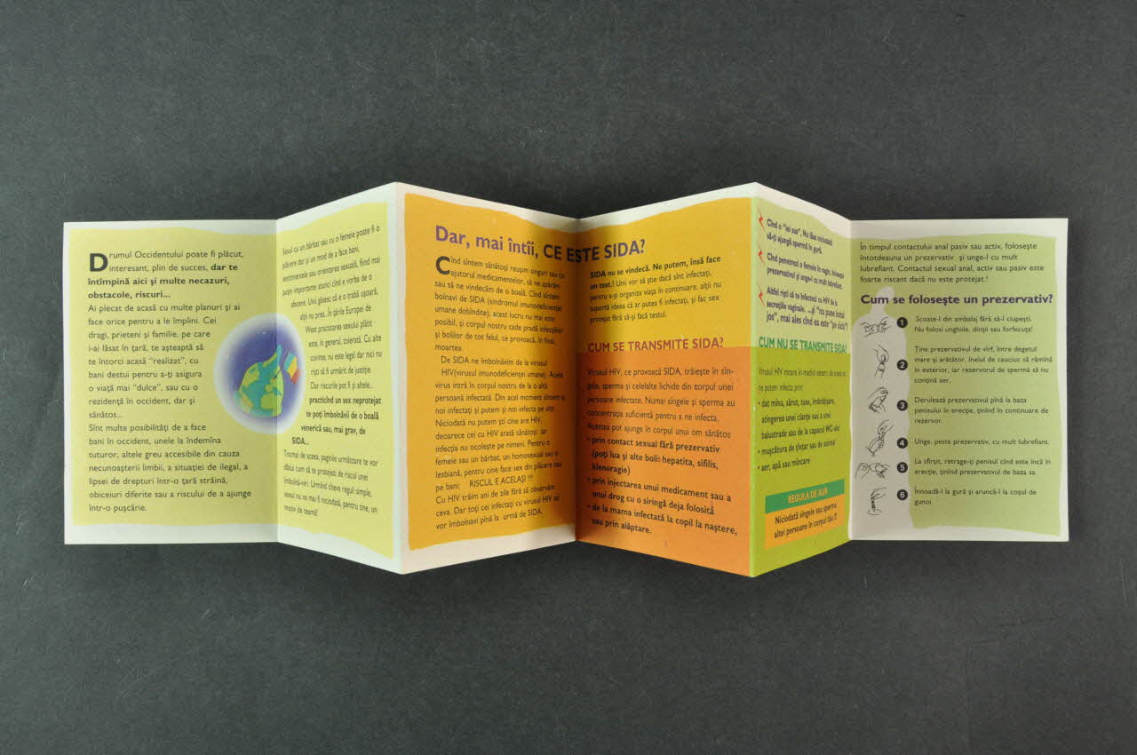 Les feuillets 5 et 6 sont contitués d'inscriptions violettes et noires sur fond vert. Au centre, six petits dessins montrent la manière de mettre un préservatif.