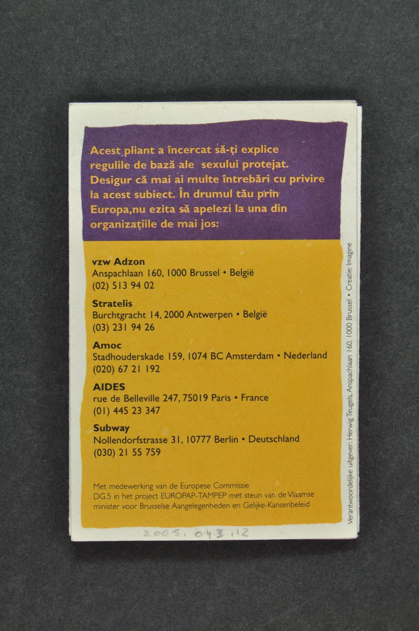 Le dos du dépliant est constitué d'un texte dans deux encadrements avec une bordure blanche. La partie supérieure du texte en orange se trouve dans un large bandeau violet. La partie inférieure est occupée par un encadré orange avec des adresses d'associations en noir.
