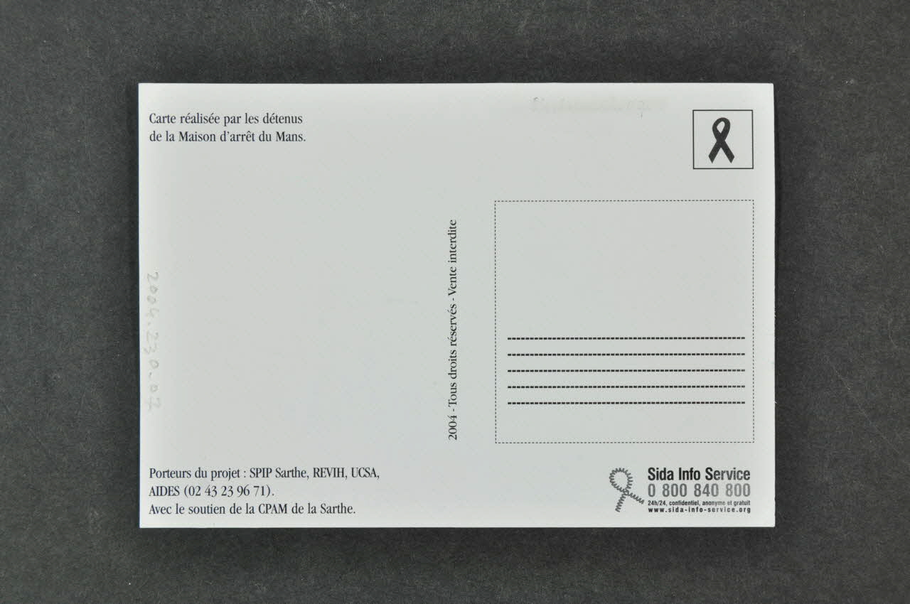 Carte postale réalisée dans le cadre d'un atelier d'expression sur le sida le 1er décembre à la maison d'arrêt du Mans et vendue à l' "exposition du ruban rouge". (2004.230.5) Double en 2004.242.9