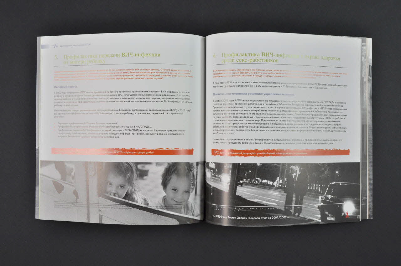Version russe du rapport 2004.239.1 Présentation de l'association et de ses programmes En 2003 passage de 90 à 116 personnes qui reçoivent constamment des formations. L'association a des programmes dans 8 pays faisant partie de la Fédération de Russie ou "nouvellement indépendants". le Kazakhstan, le Kyrgyztan, la Mongolie, la république de Moldavie, la Fédération de Russie, le Tajikistan, l'Ukraine, l'Uzbekistan. (cartes) Programmes a. Campagne dans les mass media sur le safer sex et la solidarité avec les personnes vivant avec le VIH/sida . Public cible : les jeunes entre 15 et 29 ans et tout public / Responsable du projet : Tatiana Grechukhina. / Campagne ciblée pour les jeunes en Ukraine (2° en 2003) ( faite avec le "All Ukrainian Network of people living with HIV/Aids") et en Mongolie (3° en 2003) (faite avec Focus-Media) / Campagne tout public : 5° en Fédération de Russie en 2003. Ces campagnes ont consisté en clips radio et télé, en affiches dans le métro et en annonces sur les bus, en distribution de dépliants (boites de nuit, cliniques, universités, magasines féminins (en Ukraine 500 000 dépliants et 10 000 affiches) En Ukraine : rallie dans plusieurs villes et événement lors de Halloween. Enquête KABP auprès de 1200 jeunes b. - Formation à la réduction des risques. Public cible : les programmes régionaux dirigés vers les usagers de drogues. / Responsable du projet : Yuri Sarankov. / Projet mené en Fédération de Russie, Ukraine et Moldavie. Formation donnée à 40 projets locaux en fédération de Russie, 21 en Ukraine et 7 en Moldavie. Distribution de 264.705 seringues et 99 470 préservatifs en Moldavie par l'intermédiaire de projets locaux; Publication de la BD "HIV and AIDS" pour les utilisateurs de drogue, distribuée dans 89 régions de la fédération de Russie (10 000 exemplaires) c. - Prévention du sida et promotion de la santé dans les prisons. Public cible : détenus, personnel médical et non médical des prisons, personnel médical des centres de soin du sida et de traitement des utilisateurs de drogue, personnel des associations locales des régions liées au projet / Responsable du projet : Alexey Frolov / Implantation d'activités de prévention du sida dans des prisons du Kazakhstan, du Kyrgyzstan, du Tajikistan. Publication du livre : HIV in Prisons : a manual with particular relevance foir the Newly Independent States. Destiné au personnel médical ou non des prisons (5 823 exemplaires distribués). Visites et formation des personnels. Distribution de 37 600 préservatifs et 300 litres de désinfectant pour aiguilles. Distribution de 7 620 kits. d.- Conseils avant et après le test de dépistage Public cible ; personnel de santé, personnel des organisations concernées par le dépistage du sida et leurs clients / Responsable du projet : Marina Nikitina. / Formations des professionnels de santé au Kazakhstan. Curriculum médical à l'Université de médecine. Pour tout public : affiches en russe et en kazakh sur le dépistage. Pour les responsables politiques : livre "Voluntary Counselling and testing" e.- Prévention de la transmission mère enfant / Public cible. Futurs parents, femmes séropositives, femmes enceintes séropositives, enfants nés de mères séropositives, administrateurs et professionnels de la santé / Responsable du projet : Julie Dixon / En fédération de Russie, plus de 9 000 enfants séropositifs et 1750 enfants nés de mères séropositives en 2003. / Projet pilote dans 5 régions de la fédération en lien avec les organisations locales. Groupes de support et peer counselling et lignes téléphoniques. Elaboration de protocoles devant permettre la distribution de matériel de dépistage rapide et d'antirétroviraux aux femmes enceintes séropositives. Publication d'un reader et distribution de dépliants et affiches. f.- Prévention du sida et promotion de la santé chez les travailleurs (euses) du sexe; Public cible Travailleurs du sexe, organisations, agences juridiques, professionnels de la santé travaillant dans des centres de soin des usagers de drogue, cliniques des MSI, centres et cliniques de traitement du sida, autorités nationales et locales. / Responsable du projet : Robin Montgomery / Programme en Asie centrale (Tajikistan, Uzbekistan, Kazakhstan, Kyrgyzstan) Parallèlement l'association mène un travail d'"Advocacy" auprès des gouvernements pour qu'ils fassent de la lutte contre le sida une priorité nationale. Elle mène aussi un travail auprès des pays de l'Ouest pour les convaincre de ce que le sida n'est pas uniquement un problème nord sud . En 2003 participation à la 1ère et la seconde rencontre du "US-Russia Working Group on AIDS". L'association a un département "Epidémiologie" dont les statistiques, réputées les plus fiables , sont publiées sur le site WEB. L'association a aussi un département de l'information qui assure une information fiable et adaptée à chaque région. Elle se trouve sur le site WEB de l'association. Depuis 2004 l'association reçoit de l' argent du fonds mondial. - Présentation d'une sélection de publications - Rapport financier.