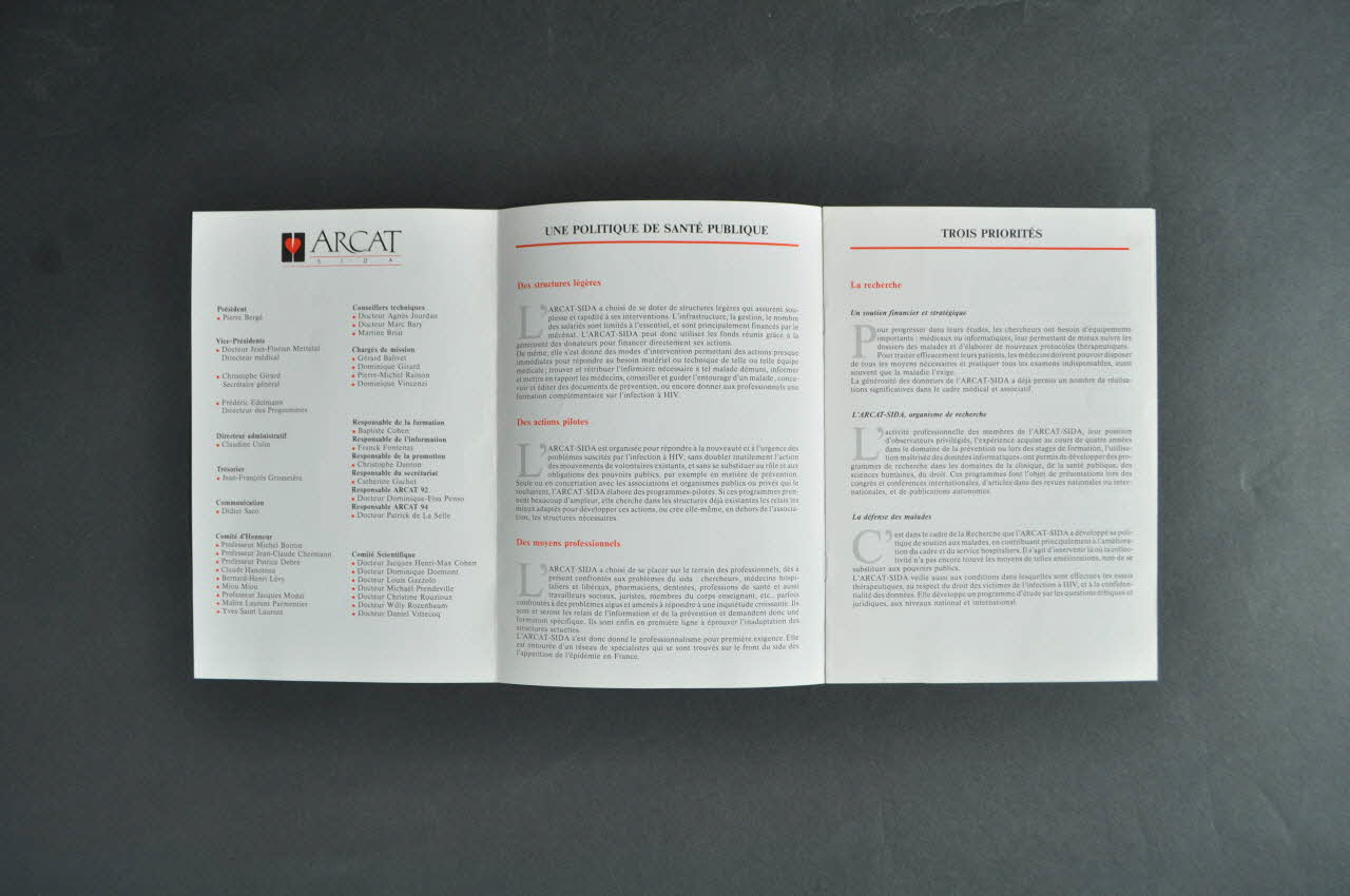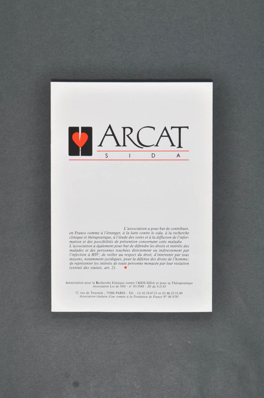 Réalisée en papier imprimé, et relié la brochure dis pages d'information en français sur une association de lutte contre le sida (ARCAT).