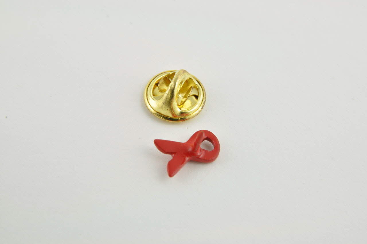 Tout petit pin's en métal ayant la forme d'un ruban rouge, fermé par un fermoir doré.Décor