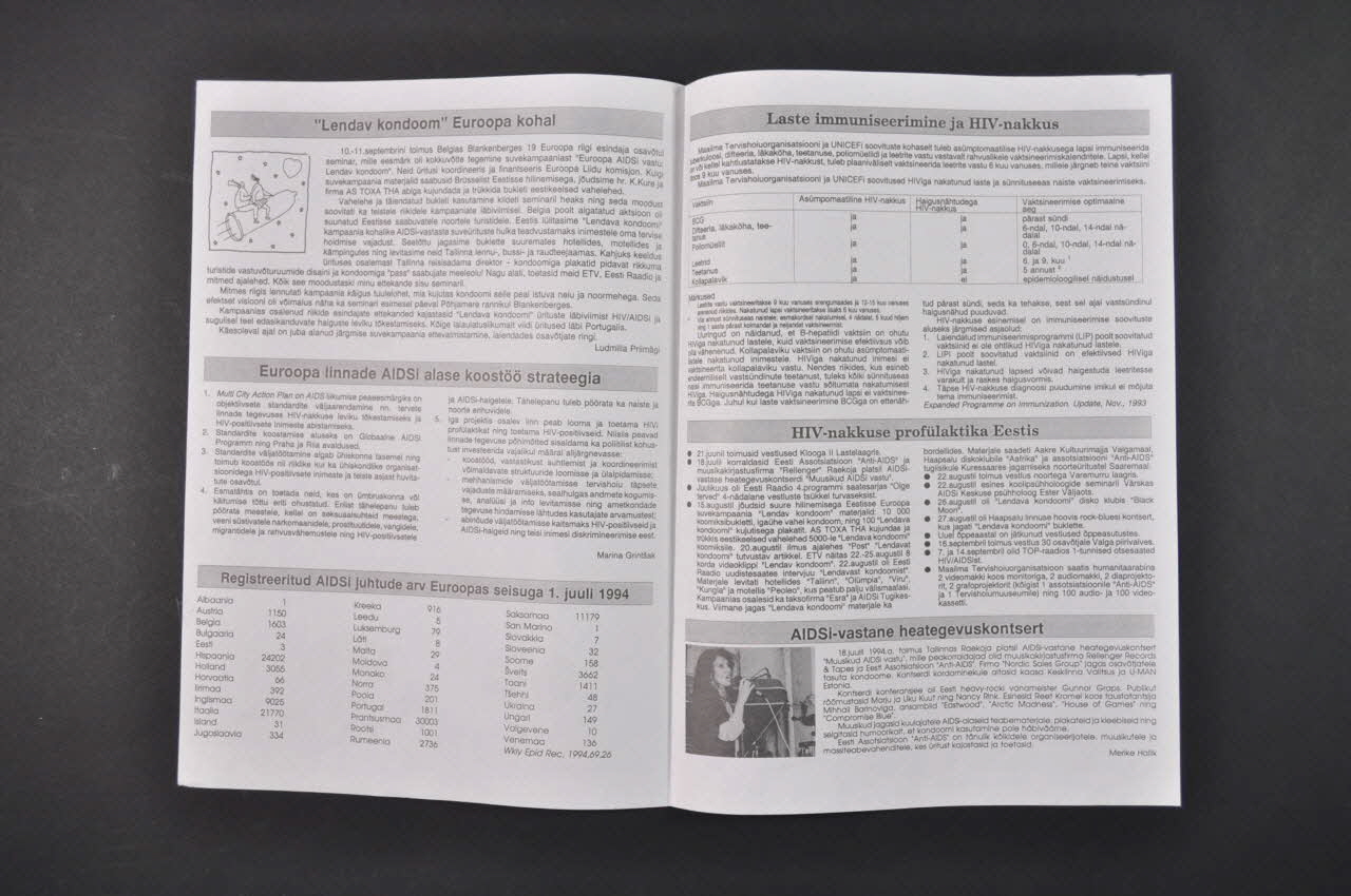 AIDSi esinemine 15 aasta jooksul // "Lendav kondoom" Euroopa kohal // Euroopa linnade AIDSi alase koostöö strateegia // Registreeritud AIDSi juhtude arv Euroopas seisuga 1.juuli 1994 // [...] // [...] (Noms des titres des différents paragraphes du bulletin), à l'intérieurANTI-AIDSi UUDISED (En haut de la première page inscrit en bleu), rectoNom d'association