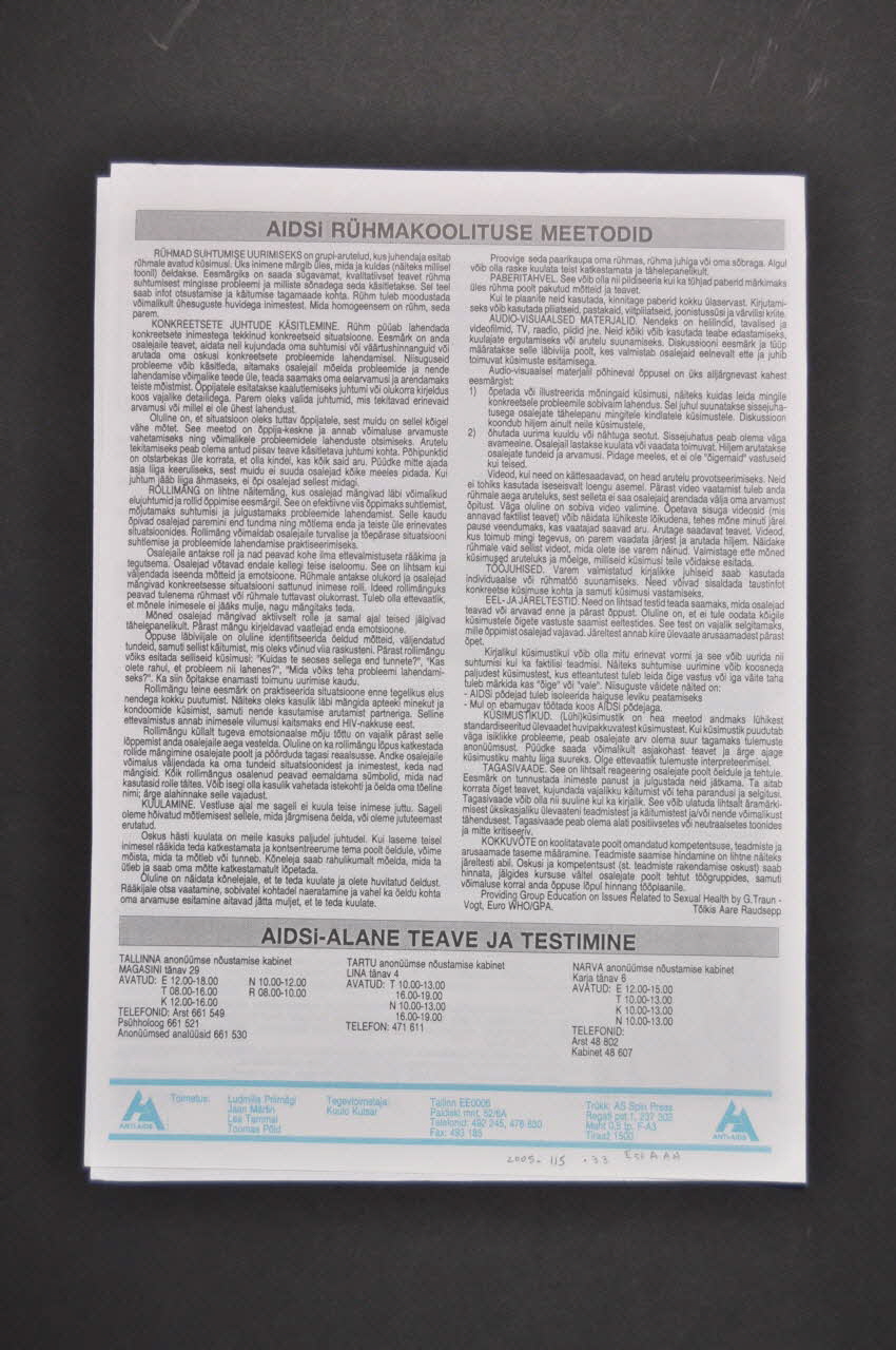 Sommaire (traduire) - ELU. Ema teresa manifest / Keegi meist ei vääri AIDSi / Keegi meist ei vääri AIDSi (Le manifeste de Mère Terésa) (poème et dessin d'une fleur) (Cf affiches 2005.115.46 et 47) - AIDSi esinemine 15 aasta jooksul (le sida dans le monde : graphique épidémiologique de 1980 à 1994) - "Lendav kondoom" Euroopa kohal (campagne européenne pour les jeunes sur le préservatif) (cf affiche 2005.010.17) - Euroopa linnade AIDSi alase koostöö strateegia - Registreeritud AIDSi juhtude arv Euroopas seisuga 1. juuli 1994 - Laste immuniseerimine ja HIV-nakkus - HIV-nakkuse profülaktika Eestis (activités de l'association ?) - AIDSi-vastane heategevuskontsert (concert / photo de la chanteuse) - AIDSi Rühmakoolituse meetodid