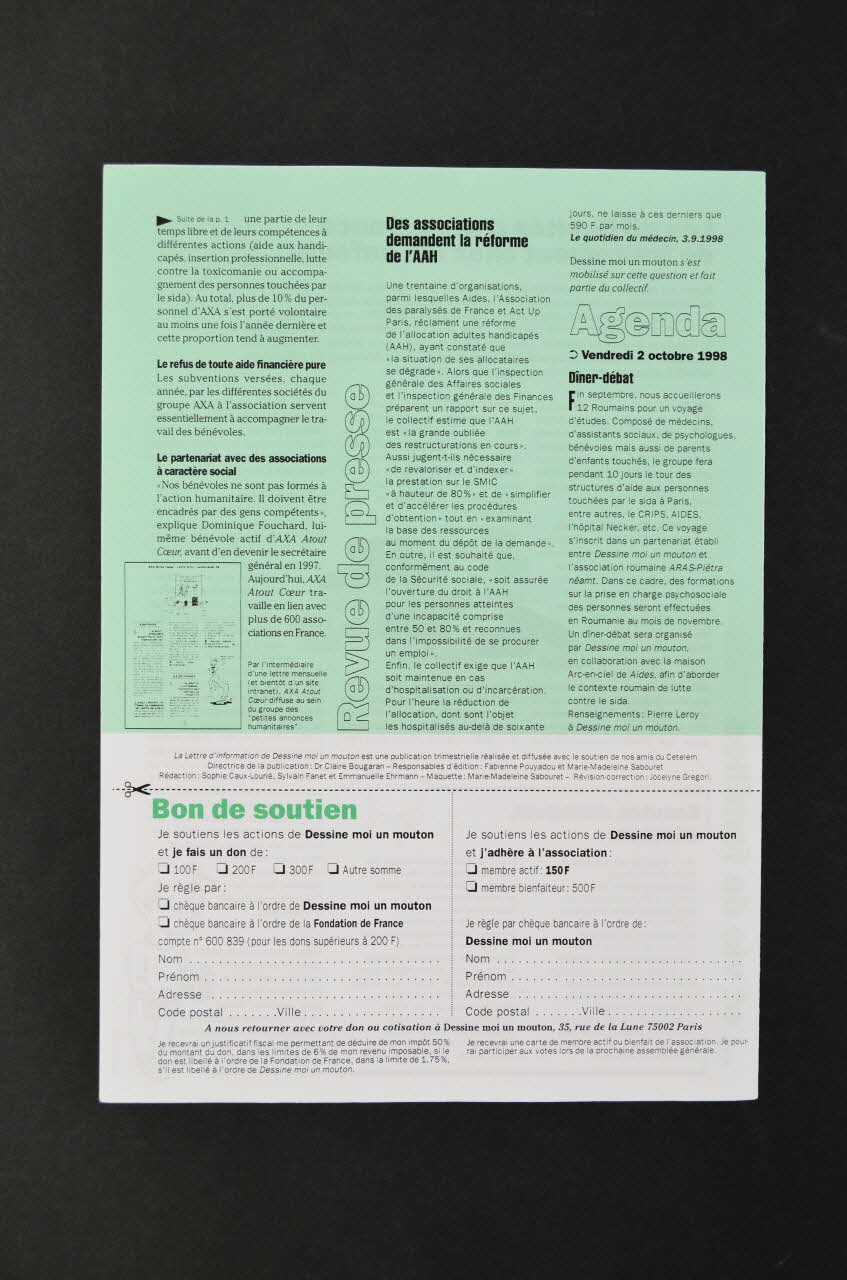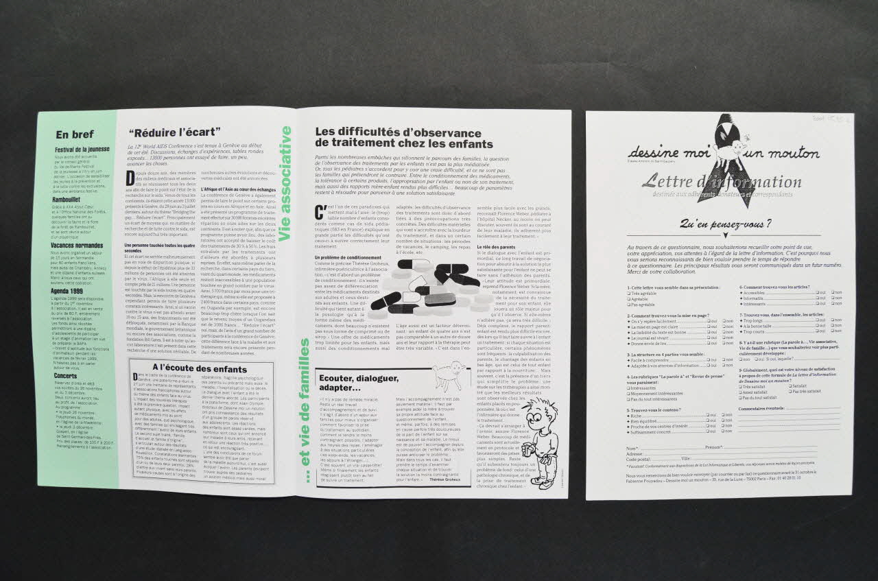 1ère page A gauche : Editorial de Dr Claire Bougaran présidente ( Soyons solidaires...) A droite : "La parole à Axa A tout Coeur. Des bénévoles qui assurent (Association de bénévoles fondée il y a 7 ans au sein du groupe Axa et en 1993 lors de l'affaire du sang contaminé se sont engagés dans la lutte contre le sida. Travail étroit avec Dessine-moi un mouton) En bas, coordonnées rue de la Lune Page 2 Vie associative (en vert verticalement) :En bref (nouvelles de l'association. ). / Réduire l'écart (Conférence de Genève; l'Afrique et l'Asie...) / A l'écoute des enfants (dans le cadre de la conférence de Genève) Page 3 "... et vie des familles (en vert verticalement ) : Les difficultés d'observance de traitement chez les enfants (conditionnements mal adaptés, rapport parents - enfants difficile...) / Ecouter, dialoguer, adapter... (accompagnement des familles pour trouver la solution la moins contraignante) Page 4 Revue de presse. Agenda (Diner débat avec association roumaine ARAS Pietranéamt / Bon de soutien