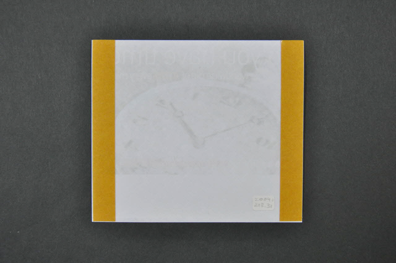 double-face / Il s'agit d'un autocollant dont le fond représente (en photographie) le cadran d'une montre à gousset. De part et d'autre (parties supérieure et inférieure) figure du texte.Décor