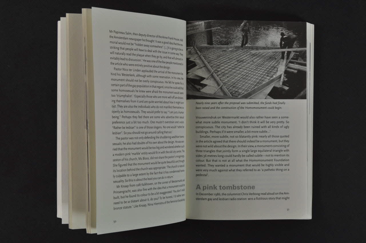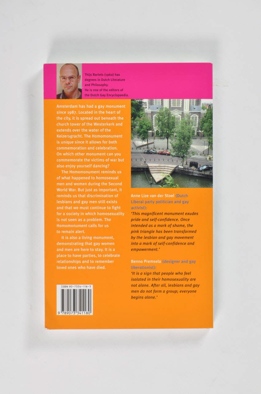Dancing on / the homo- / monument (Sommaire. // Traduction : // - p.11- 18 Introduction // - p.11 National et international // - p.12 Héros et victimes // - p.15 Plus jamais // - p.16 Commémorer et célébrer (allusion au sida : "Le monument est aussi utilisé pour commémorer ceux qui sont morts du sida) // - p.17 Pas des chevaux sur le monument, mais des triangles // - p.19-48 Le premier triangle : le passé // - p.20 Un appel à l'attention // - p.21 Un monument visible à tous // - p.23 Le chapitre oublié (de la déportation homosexuelle) // - p.24 Une lumière dans l'obscurité // - p.25 L'idéologie nazie // - p.26 Les idées nazis sur les gays // - p.28 Et qu'en est-il des lesbiennes ?` // - p.28 Lois contre les homosexuels // - p.29 Les conséquences // - p.30 Oppression et persécution // - p.32 Aux Pays-Bas // - p.34 Une menace constante // - p.35 Regarder en face les faits (à partir des années 80) // - p.36 Le bon moment (pour faire le projet de monument) // - p.37 Un climat de libération // - p.39 Le projet de monument)Thijs Bartels (Titre sur la couverture.)(Texte de présentation en quatrième de couverture. // Traduction : Texte en anglais. // Résumé (en dos de couverture) // Amsterdam a un monument gay depuis 1987. Localisé au coeur de la ville, il s'étend au delà de la tour de l'église de Westerkerk et va jusqu'à l''eau du canal de Keizersgracht. Le "Homomonument" est unique dans la mesure où il permet à la fois le commémoration et la célébration. Sur quel autre monument pourriez vous tout à la fois commémorer les victimes de la guerre et vous réjouir en dansant ? Le "Homomonument" nous rappelle ce qui est arrivé aux hommes et aux femmes homosexuels pendant la seconde guerre mondiale. Mais, ce qui est tout aussi important, il nous rappelle que la discrimination des lesbiennes et des gays existe toujours et que nous devons continuer à nous battre pour une société dans laquelle l'homosexualité n'est plus considérée comme un problème. Le "Homomonument" nous appelle à rester vigilants. C'est aussi un monument vivant, démontrant que les femme)(Auteur, sur la couverture.)(Traduction de la page 99 : // : "Un autre type de monument - cette fois pas pour commémorer l'holocauste des victimes homosexuelles de la seconde guerre mondiale mais pour commémorer ceux qui sont morts du sida est le "Aids Memoriel Quilt" un collage énorme de panneaux de tissu, chacun portant le nom d'une personne décédée du sida. Le quilt a été déployé pour la première fois ) Washington en 1987 et a ensuite voyagé à travers le monde. C'est un symbole de commémoration et d'espoir.")Décor