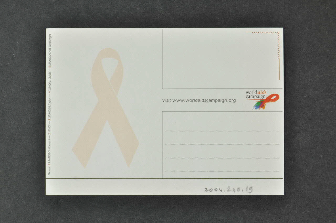 Dans l'angle droit inférieur, on voit le logo d'une association dans un rectangle blanc. Le verso est illustré en sous-impression d'un noeud rouge qui symbolise la lutte contre le sida. Carte postale distribuée en 2004 à la cérémonie du 1er décembre organisée par ONUSIDA.Inscriptions