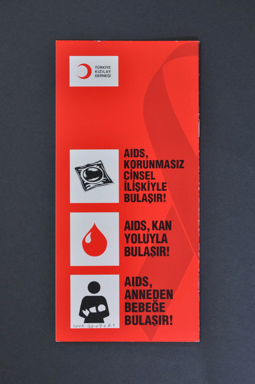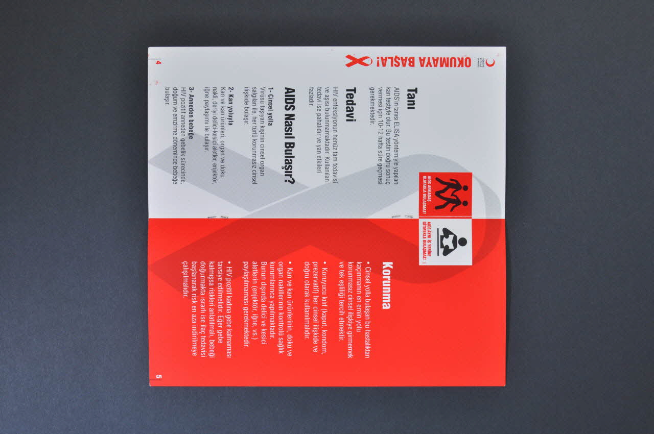 - p.2 Logo du Croissant rouge avec en dessous, en noir, numéros de téléphone utiles. - p.3 AIDS Nedir? (en noir) / En dessous, texte en blanc - p.4 Verticalement à gauche, en rouge, logo du Croissant rouge, puis, en petites capitales rouges : "Okumaya Basla !" (traduire), puis petit ruban rouge. En haut, à droite, petiit carré rouge avec deux silhouettes masculines se tenant par la main et en dessous, en blanc : "AIDS Arkadas Olmakla bulasmaz !". En dessous, texte avec trois sous titres : Tani / Tedavi / AIDS Nasil Bulasir ? - p.5 En haut, à gauche, petiit carré blanc avec une silhouette tenant un livre et en dessous, en rouge : "AIDS Ayni is yerine gitmekle bulasmaz !" En dessous, texte avec comme sous titre : Korunma. - p.6 Verticalement à gauche, en rouge, logo du Croissant rouge, puis, en petites capitales rouges : "Okumaya Basla !" (traduire), puis petit ruban rouge. En haut, à droite, petiit carré rouge avec deux silhouettes et en dessous, en blanc : "AIDS okula gitmekle bulasmaz !". En dessous, texte avec comme sous titre : AIDS' in Bulasmadigi Durumlar. - p.7 En haut, à gauche, petiit carré blanc avecun moustique et en dessous, en rouge : "AIDS sivrisinek isirmasiyla bulasmaz !" En dessous, texte avec comme sous titre : Dünyada ve Türkiye' de AIDS" Et, en bas, en grandes italiques blanches : "Unutmayin, tedbirler alarak ve riskleri azaltarak hem kendinizi hem de baskalarini korumak hepimizin görevi !"
