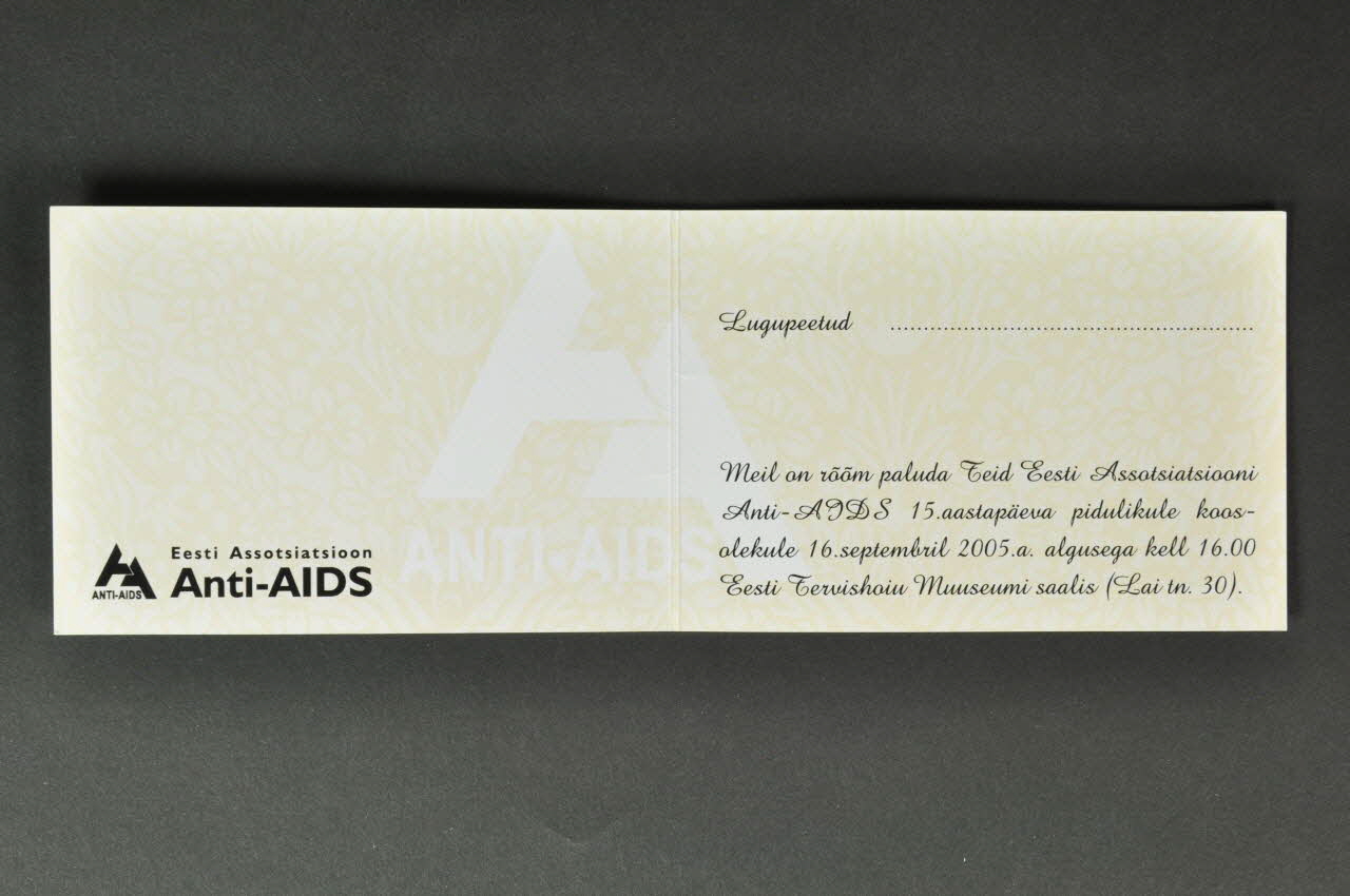 Meil on rõõm paluda Teid Eesti Assotsiatsiooni // Anti-AIDS 15.aastapäeva pidulikule koos- // olekule 16.septembril 2005.a. algusega kell 16.00 // Eesti Tervishoiu Muuseumi saalis (Lai tn. 30). (Paragraphe d'invitation, description de la soirée.), à l'intérieurLogo