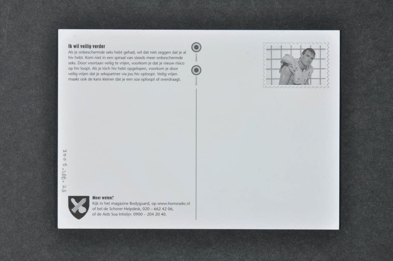 Le recto reproduit la photographie d'un jeune homme dans un escalier, tiré vers le haut par le bras d'un autre homme. Deux bulles sont visibles, l'un reliée à sa tête, l'autre à la zone de son sexe. Le verso est divisé en deux parties par un trait surmonté de deux cercles constituant deux logos. Dans la moitié gauche, en partie supérieure est visible un texte. Un logo et une adresse sont situés en partie inférieure. La moitié droite présente uniquement dans son coin supérieur droit une évocation de la forme d'un timbre dans lequel se trouve la photographie en noir et blanc un homme portant un gilet de sauvetage.Inscriptions
