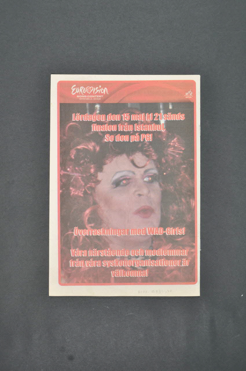 Lördagen den 15 maj kl 21 sänds // finalenfrån Istanbul. // Se den på PG ! // // Överraskningar med WAD-Girls ! // // Våra nårstående och medlemmar // från vår syskonorganisationner är // välkomna ! (en quatrième de couverture, en lettres rouges)Décor