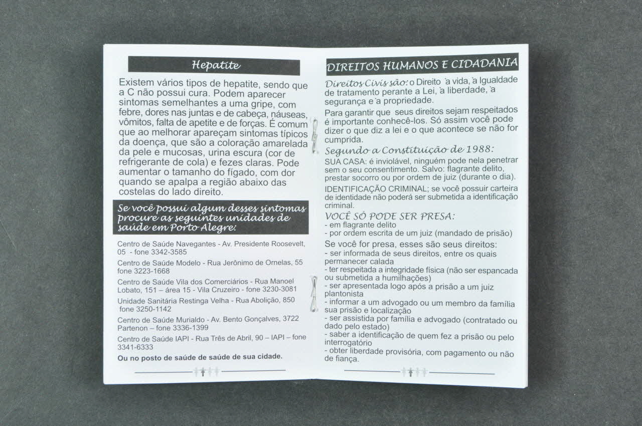 1 .....Fique ATINADA [...] // 2 .....saúde e prevençáo [...] // 2 .....Portanto, use sempre camisinha. [...] // 3 .....Como se pega o HIV: [...] // 3 .....Como náo se pega o HIV [...] // 3 .....Náo seja lesada [...] // 4 .....Dicas de Sexo Seguro [...] // 4 .....Cuíde de sua saúde [...] // 5 .....ONDE FAZER O TESTE DO HIV: [...] // 5 .....Tuberculose [...] // 6 .....Hepatite // 6 .....Se você possui algum desses sintomas // procure as seguintes unidades de // saúde em Porto Alegre: [...] // 7 .....DIREITOS HUMANOS E CIDADANIA [...] // 8 .....SE LIGA: Prostituiçáo náo é críme. // Todos tem o díreíto de IR, VIR e // PERMANECER onde quiser. [...] // 9 .....Dicas rápídas para você ficar segura. [...] // 10....Enderços Uteís [...] // 10 ...Para fazer Documentos [..] // 11....Artículaçáo Nacíonal de // Transgêneros - ANTRA (Imprimé en blanc dans des rectangles noirs), à l'intérieurSous-titre