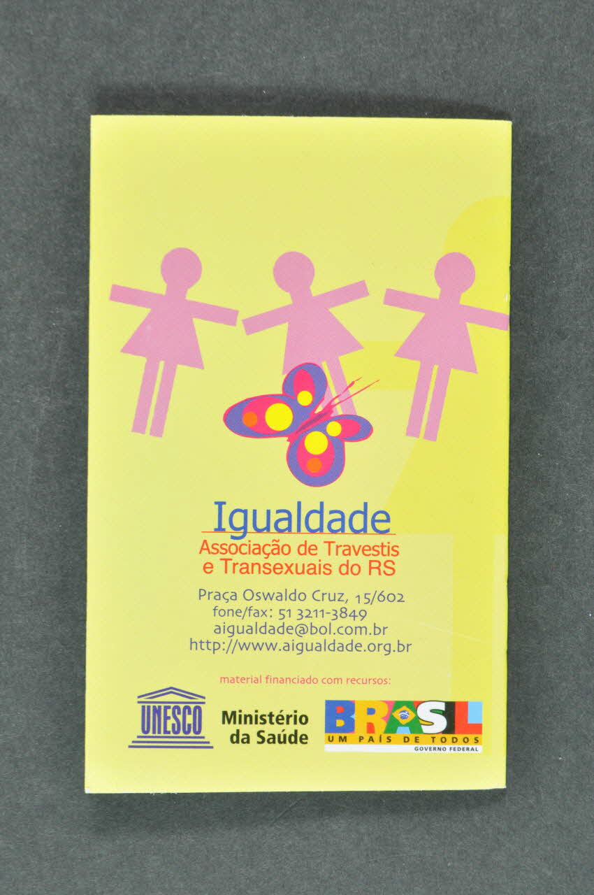 Igualdade // Associaçáo de Travestis // e Transexuais do RS // // Praça Oswaldo Cruz, 15/602 // fone/fax: 51 3211-3849 // aigualdade@bol.com.br // http://www.aigualdade.org.br (Imprimé en bleu et rouge dans la moitié inférieure), versoDécor
