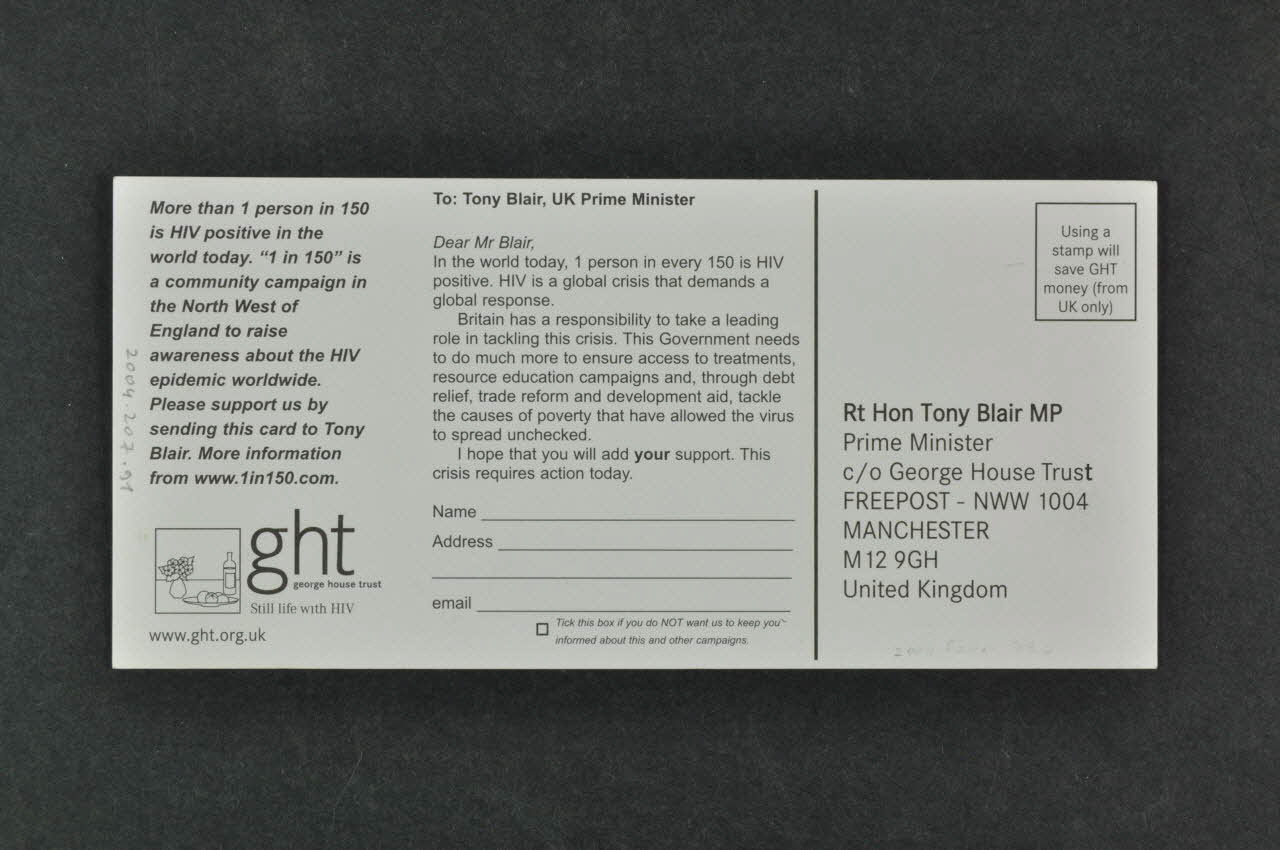 www.1in150.com (en bas à droite), rectoRt Hon Blair MP // Prime Minister // c / o George House Trust // FREEPOST - NWW 1004 // MANCHESTER // M 12 9 GH // United Kingdom (à droite), versoTexte