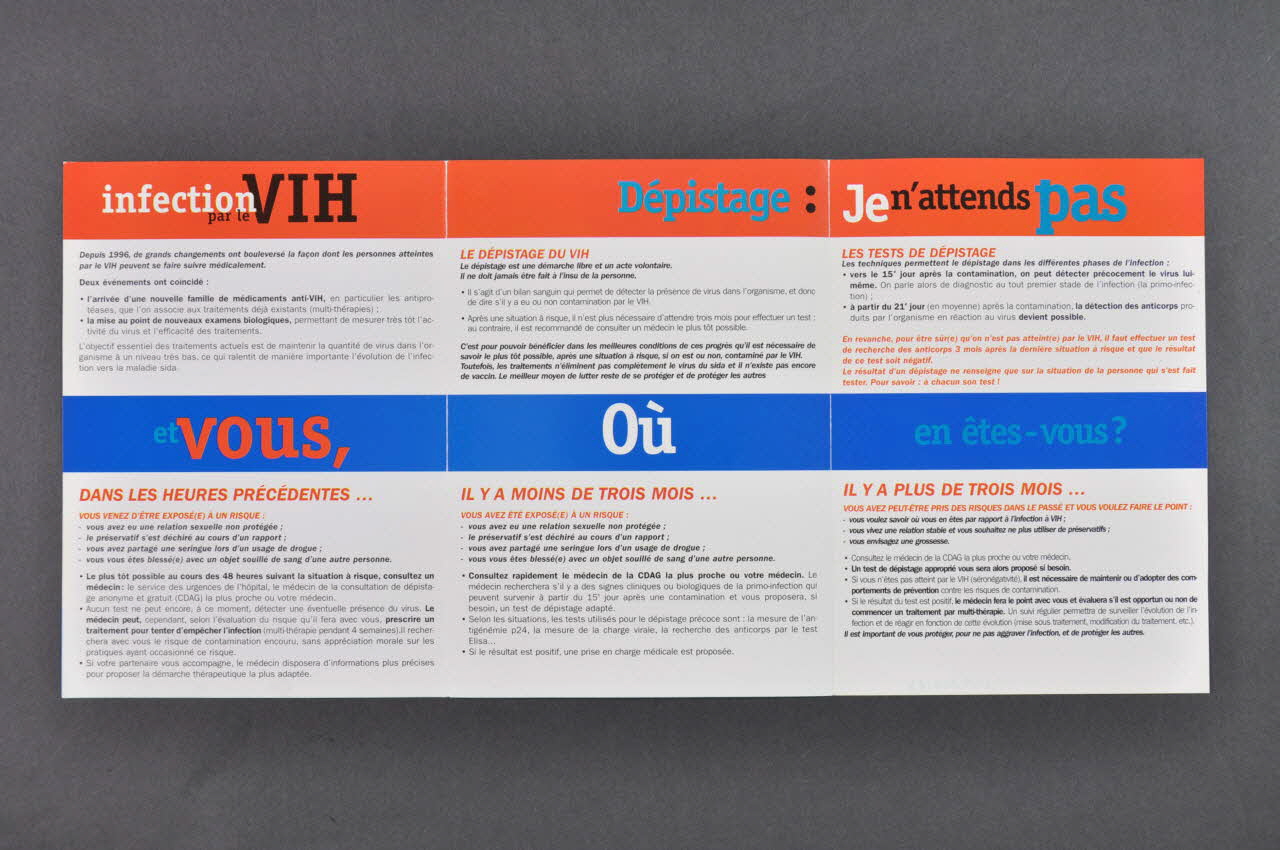 Version de 2003 en 2005.008.68 Feuillets 1 à 3 Fond blanc, impression en noir, sous titres et points importants en rouge. En haut, bandeau rouge, au centre, bandeau bleu. Sur le bandeau rouge du haut : "Infection par le VIH" (en blanc et noir) / "Dépistage :" (en vert) / "Je n'attends pas" (en blanc, noir et vert) Sur le bandeau bleu au centre : "et vous," (en vert et rouge) / " Où" (en blanc) / "en êtes-vous ?" (en vert) Feuillet 1 En haut : les progrès depuis 1996 : nouveaux traitements et nouveaux examens biologiques. En bas : " Dans les heures précédentes, vous venez d'être exposé(e) à un risque" Feuillet 2 En haut : "Le dépistage du VIH" En bas : "Il y a moins de trois mois... vous avez été exposé(e) à un risque" Feuillet 3 En haut : "Les tests de dépistage". En bas : "Il y a plus de trois mois... vous avez peut être pris des risques dans la passé et vous voulez faire le point." Feuillet 4. Fond bleu. Encadrement rouge. Texte en blanc : Parmi les personnes atteintes par le VIH, nombreuses sont celles qui ne le découvrent qu'à un stade déjà avancé de l'infection. / Elles n'ont donc pas pu jusque là bénéficier des traitements efficaces existants, qui permettent de ralentir considérablement l'évolution de l'infection. / N'hésitez pas à en parler à votre médecin/ Les traitements / Actuellement les traitements ne sont plus seulement prescrits à un stade avancé de l'infection (...) / Il n'est jamais trop tard pour bénéficier d'un traitement : toutefois, la précocité de la prise en charge médicale favorise son efficacité. / Cependant, les traitements ne permettent pas
