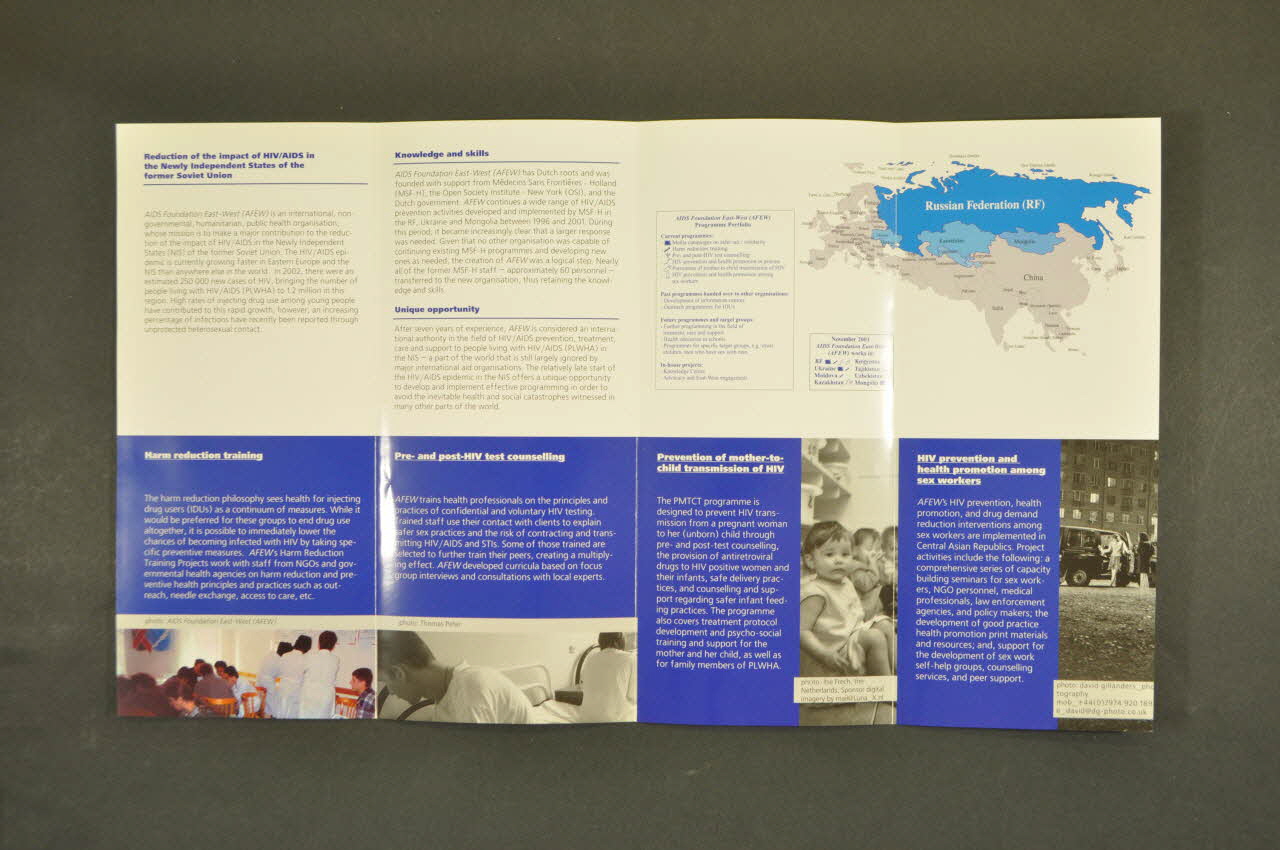 Feuillet 1 Haut : Réduction de l'impact du VIH/sida dans les états nouvellement indépendants de l'ancienne Union Soviétique (présentation de l'association et quelques données épidémiologiques) / Bas : Projets de réduction des risques pour les usagers de drogues. Feuillet 2 Haut Création de l'association avec le support de Médecins sans Frontières / Importance unique de l'association. / Bas : Counselling pré et post test de dépistage. Feuillets 3 et 4 Haut. Carte montrant les implantations des programmes / Bas feuillet 3 : Prévention de la transmission mère enfant / Bas feuillet 4 Prévention du VIH et promotion de la santé chez les travailleurs du sexe Feuillet 5 Haut : Les programmes (ceux qui sont décrits en bas de chaque feuillet) / Bas : Campagnes dans les medias sur le safer sex et la solidarité avec les personnes vivant avec le VIH/sida Feuillet 6 Haut :Engagement Ouest / Est et les missions de l'association / Bas : Prévention du VIH et promotion de la santé dans les prisons.