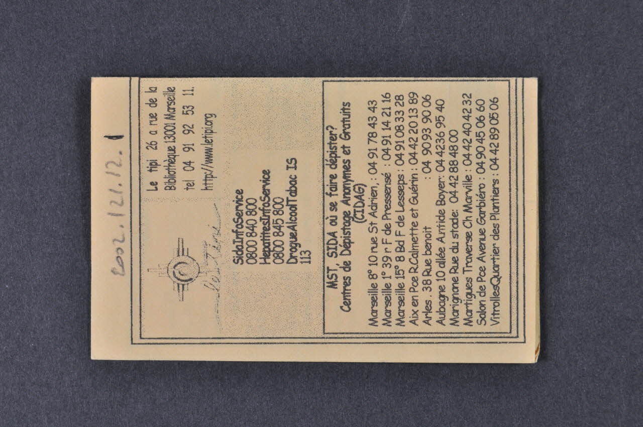 De : Lieu : Marseille, Bouches-du-Rhône, Provence-Alpes-Côte d'Azur, FranceDate : 2002Fait partie d’un ensemble de flyers destiné à être largement diffusé dans les fêtes pour avertir sur les risques de certaines infections sexuellement transmissibles (activité de réduction des risques de l’association). L’information est donnée en relation avec l’augmentation des risques de contamination par le VIH.