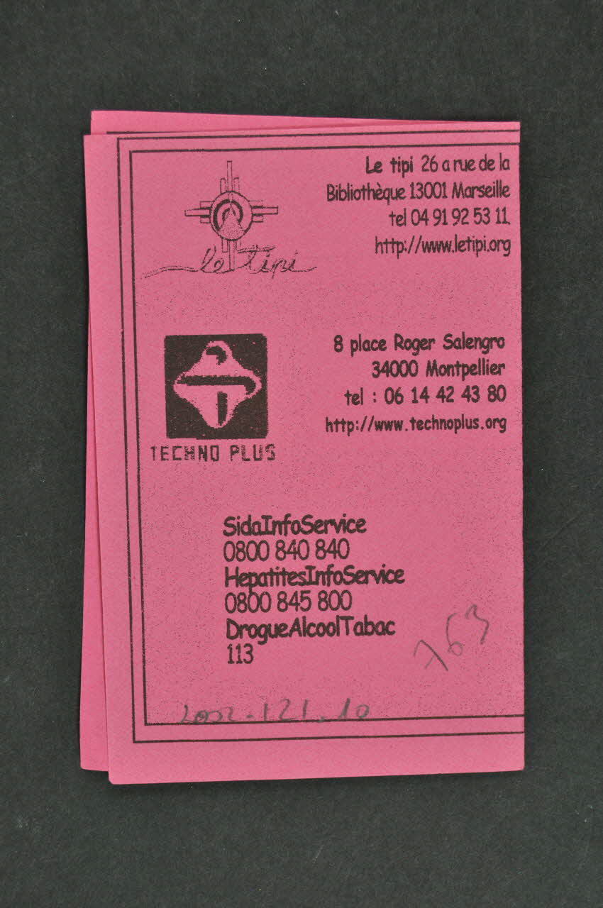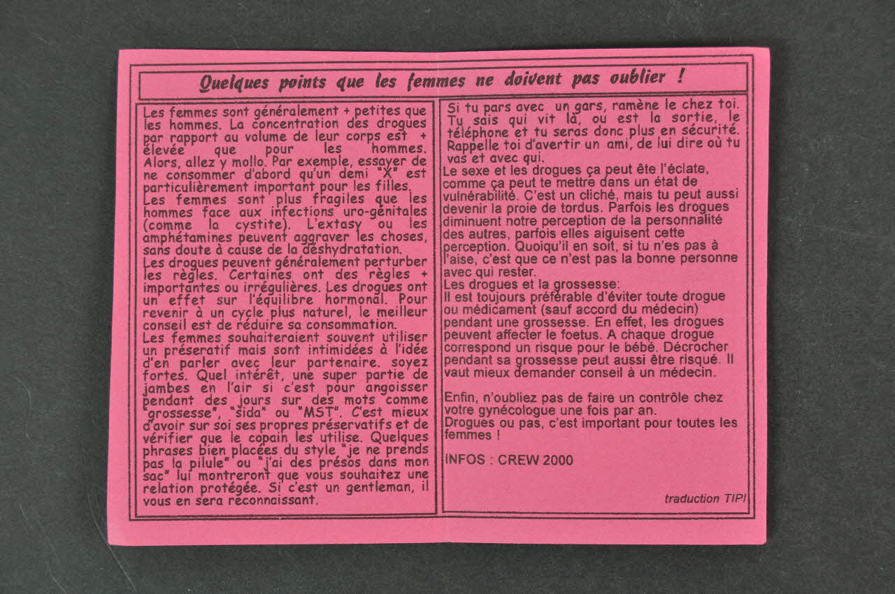 Quelques points que les femmes ne doivent pas oublier ! (en haut, sur deux feuillets), à l'intérieurLe tipi 26 a rue de la // Bibliothèque 13001 Marseille // tel 04 91 92 53 11 // http://www.letipi.org // // 8 place Roger Salengro // 3400 Monpellier // tel : 06 14 42 43 80 // http://www.technoplus.org (en bas, au centre), versoTitre, sous-titre