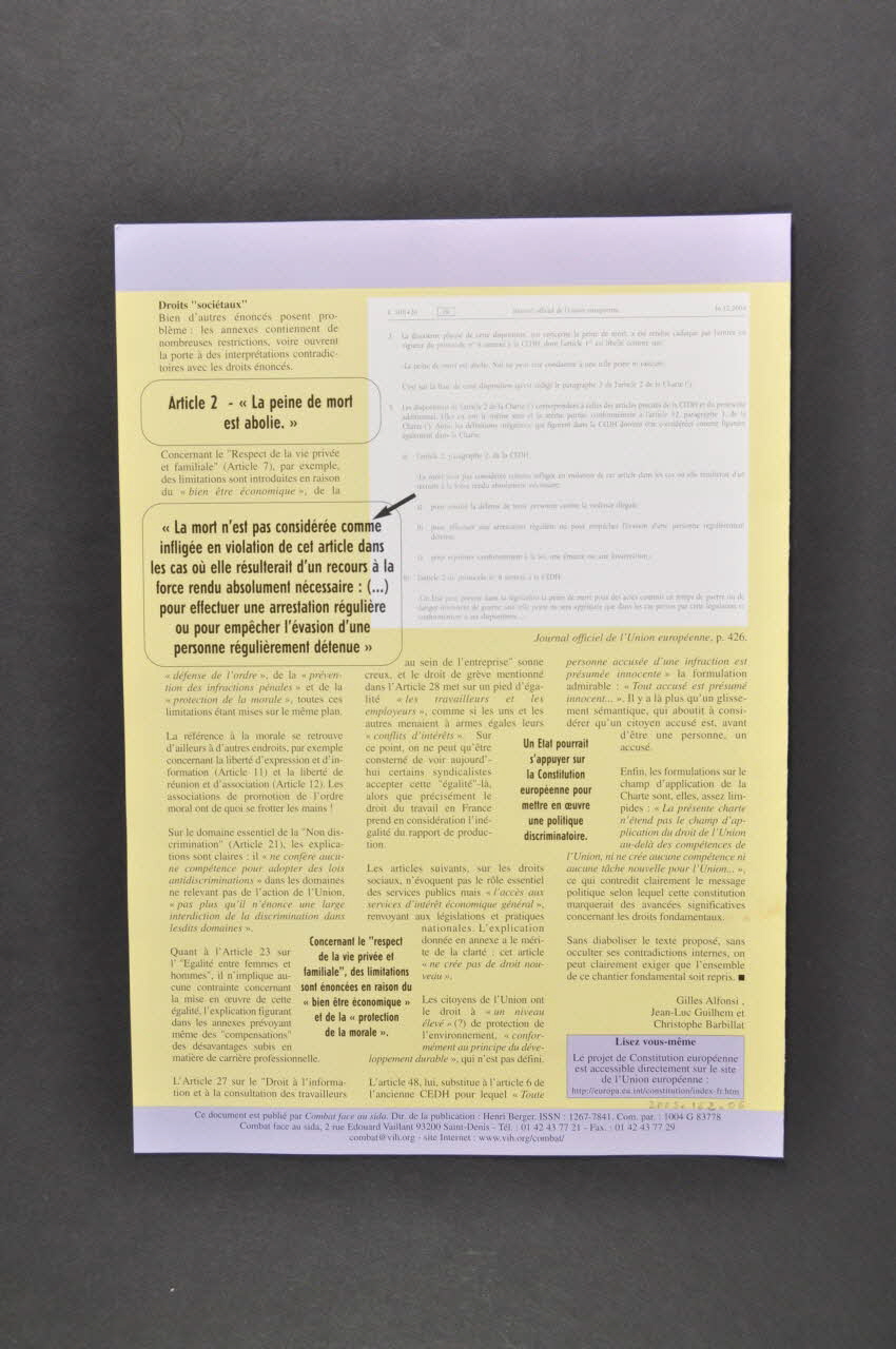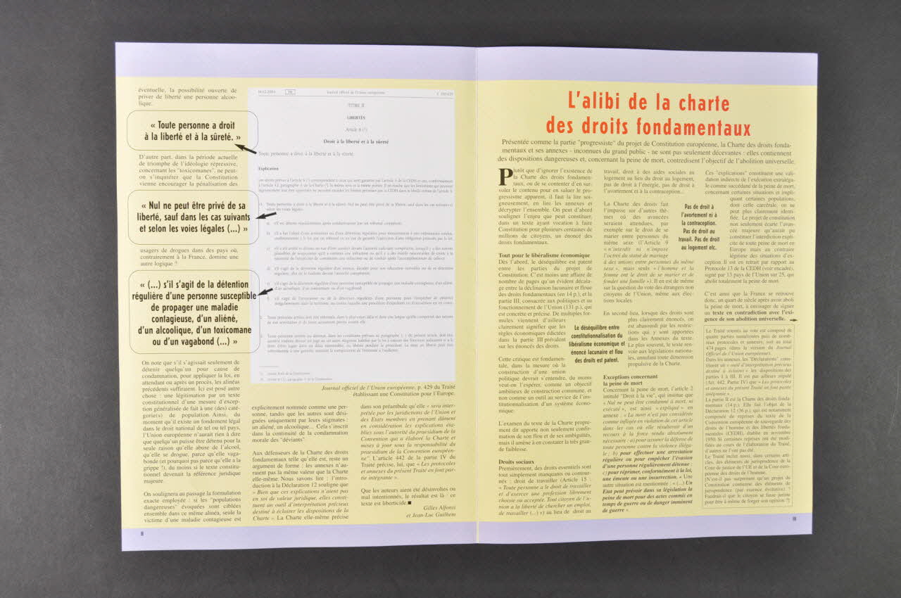 Referendum sur la Constitution européenne. La charte des droits fondamentaux en question // Vagabonds, malades contagieux, aliénés, alcooliques, toxicomanes. Tous en prison ? // Notre responsabilité // L'alibi de la charte des droits fondamentaux, sur la couvertureDécor