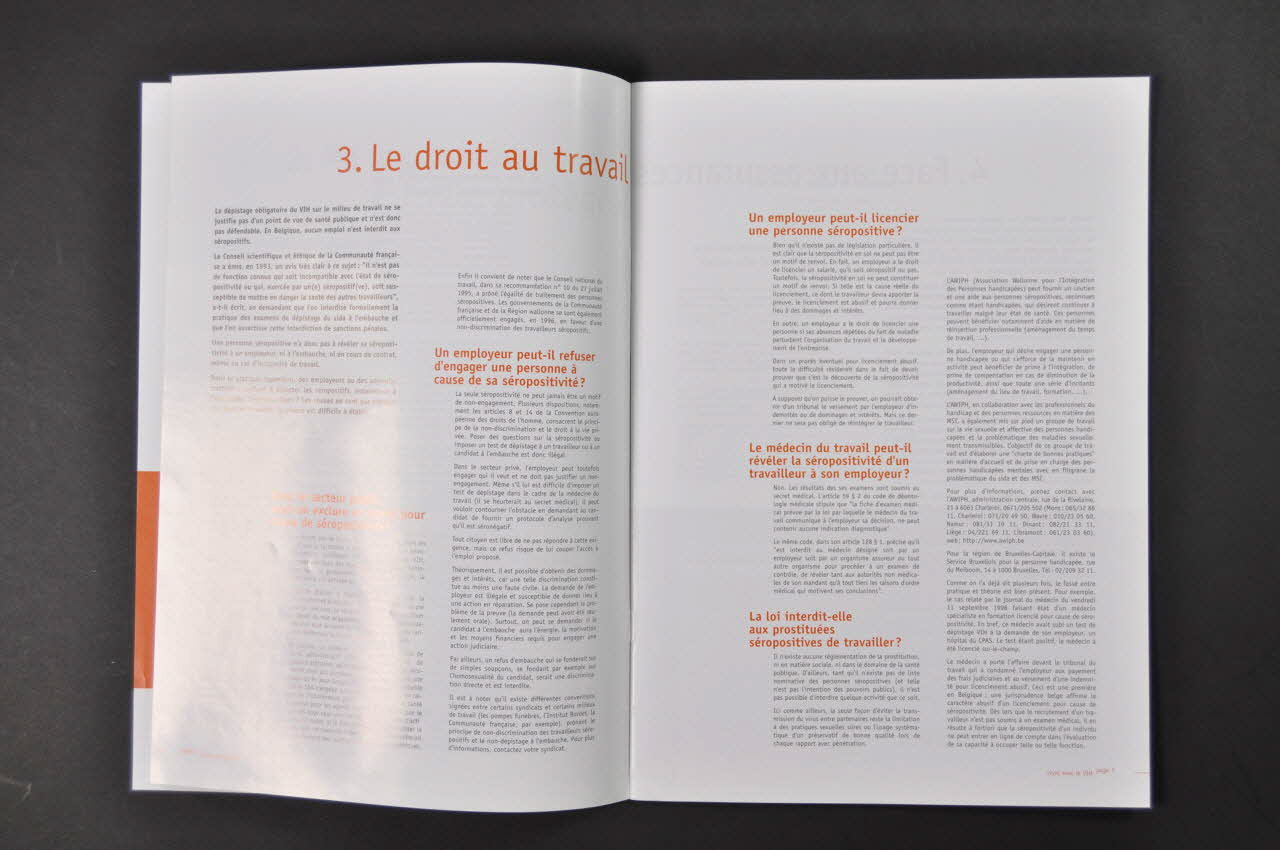 Sommaire : // 1. Editorial. Faire valoir ses droits. // 2. Ma vie privée est-elle protégée ? // 3. Le droit au travail // 4. Face aux assurances // 5. Sida et sécurité sociale // 6. Le droit au logement // 7. Accueillir les enfants séropositifs // 8. Les migrants face au VIH-sida : une situation de vulnérabilité // 9. Homosexuels et cohabitants : prévoir l'avenir // 10. Sida et système de santé // 11. Voyages // 12. Les prisons // 13. Adresses utiles // 14. Questionnaire (avis sur la brochure) (page 1), sur la couvertureLogo, nom d'association