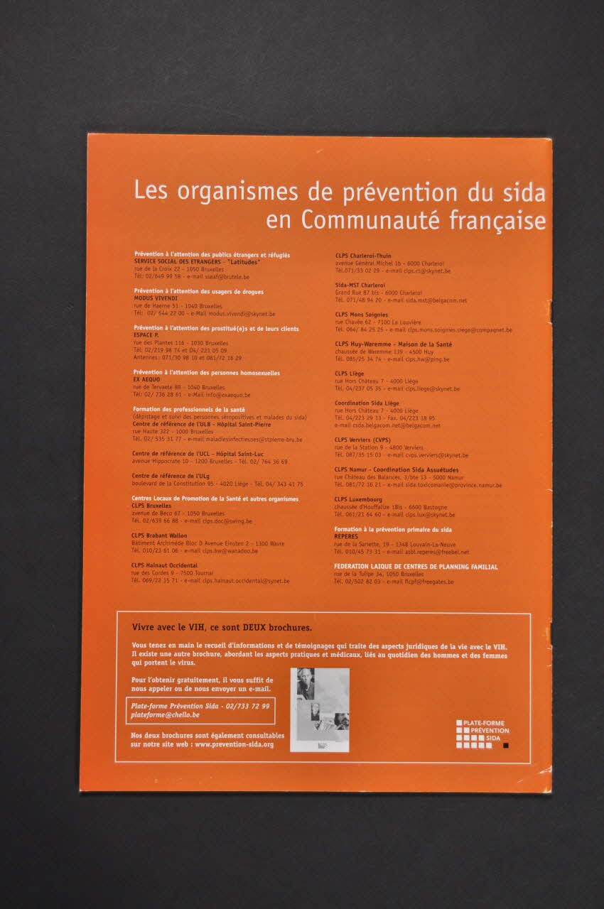 Le dos a un fond orange avec la liste en noir et blanc des organisme d'aide et de prévention du sida. A l'intérieur, le fond est blanc avec le texte imprimé en noir. Titres et sous titres sont imprimés en orange et les encarts en blanc sur fond orange. Le texte est émaillé de six longs témoignages.Inscriptions