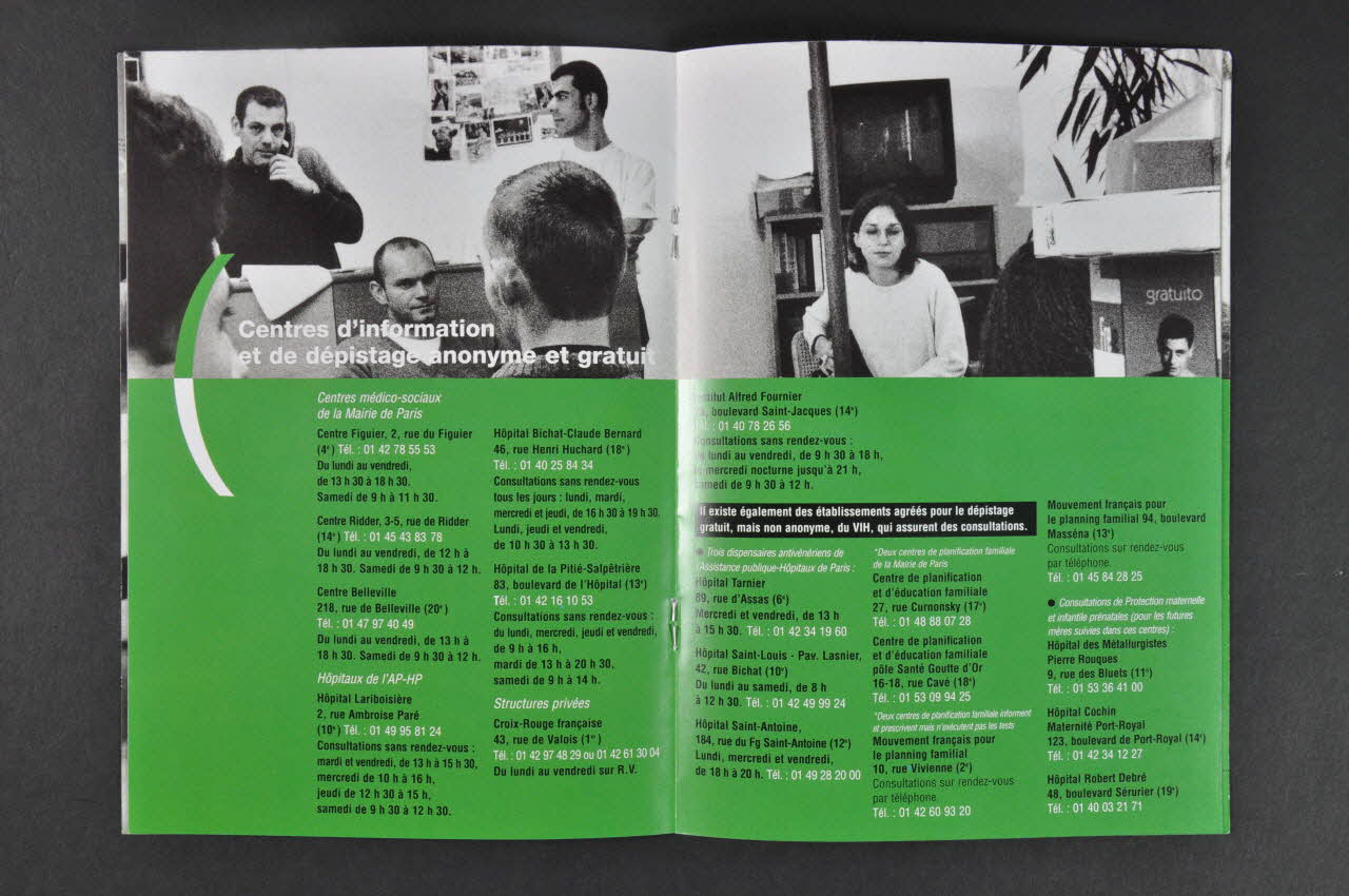 Résumé. p. 1 En sous impression, photo floue de deux hommes de dos dans un bureau où on distingue une affiche sur le sida avec phrase de Tibéri en dessous. A droite, titre en vert : Solidarité . Texte : "Aujourd'hui, il n'est plus possible de penser que le sida ne nous concerne pas. A Paris, et en région Ile-de-France, plusieurs dizaines de milliers de personnes sont contaminées. Demain, peut être un parent, un ami, un collègue de travail sera touché et aura besoin de notre aide et de notre soutien" (en blanc) : "Face à l'angoisse, au désespoir, à la discrimination, à la solitude et au rejet, de nouvelles solidarités se sont créées" p. 2 à 4 : fond vert p. 3-4 photo de personnes ensemble dans un lieu amical "La mairie de Paris contribue à la mise en place et au financement de plusieurs structures...) De nombreuses associations sont ainsi des partenaires réguliers de la Mairie de Paris contre le sida . Liste de centres et associations classés par arrondissement avec coordonnées et code d'activités, se prolongeant p. 3 -4 (code d'activités : 1 soins; 2 soutien psychologique; 3 aide sociale; 4 maintien à domicile; 5 accueil de jour; 6 hébergement; 7 femmes et enfants; 8 accueil et suivi des toxicomanes; 9 défense des droits ) : Fondation Claude Pompidou, 2 / Dessine-moi un mouton, 3,7 / Vaincre le Sida, 1, 2, 3, 4, 5, 6, 9 / Cité Saint-Martin, 3,6 / Basiliade, 2,3,5,6 / Oeuvre Grancher, 7/ Tibériade, 2,3,5 / SOS Aparts, 3, 6/ SOS Présence à domicile, 4 / Siloë, 6 / Horizons, 2,3,7/ AIDES Fédération, 2,3,9 / Act-Up Paris, 9 / Aux Captifs la libération, 8 / Les amies du Bus des Femmes, 3, 9 / Association Ressources Réflexions VIH, 1, 2, 3, 9 / MAAVAR, 3,6, 8 / Médecins du Monde, 1,3 / Studios de la Tourelle 6 / Abritoit, 2,3,6 / Armée du Salut, 3,6 / Aurore Espace Rivière, 3, 6 / Foyer La Berlugane, 6 / Association Charonne, 6, 8 / Ass. Marie-Louise Trichet, 6, 7 / SOL EN SI/ 7 Centre Confluences, 6, 8 / Centre DIDRO l'Oasis, 6 / Aurore, 3, 6 / Fondation M-J Chérioux, 3 / Centre médical Marmottan, 1, 8 / URACA, 1, 2, 7, AIDES paris Ile-de-France, 2, 3, 4, 9 / Atelier des Epinettes, 5 / Résidence Cordia, 6 / VLS Villa Amédée, 6 / Actions Traitements, 9 / ALTERNATHIV, 6 / ARCAT SIDA, 2, 3, 6, 9 / Sol en Si, 7 p. 5-6 Fond vert; photos de personnes "Centres d'information et de Dépistage Anonyme et Gratuit " (coordonnées de 11 consultations) coordonnées et horaires de : les 3 Centres médico-sociaux de la Mairie de Paris ( Figuier, Ridder, Belleville); hôpitaux de l'APHP (Lariboisière, Bichat - Claude Bernard, Pitié Salpétrière); structures privées (Croix Rouge Française, Institut Alfred Fournier) "Il existe également des établissements agréés pour le dépistage gratuit, mais non anonyme, du VIH, qui assurent des consultations : trois dispensaires antivénériens de l'APHP (Tarnier, Saint-Louis, Saint-Antoine); deux centres de planification familiale de la Mairie de Paris; deux centres de planification familiale qui informent et prescrivent mais n'exécutent pas les tests; Consultations de PMI pour les futures mères suivies dans ces centres (Hôpital des Métallurgistes, Hôpital Cochin, Hôpital Robert Debré) p. 7 Photo noir et blanc, tête d'homme souriant. Titre en caractères verts : "Soins" "Pour améliorer les conditions de prise en charge des personnes atteintes par le VIH, une collaboration étroite a été mise en place entre les médecins hospitaliers, les médecins de ville et tous les professionnels de santé susceptibles d'intervenir au cours de la maladie. Ainsi, les malades sont suivis par les CISIH (centres d'information et de soins de l'immuno-déficience humaine) au sein de la plupart des garnds hôpitaux et par les médecins des villes. p. 8-9 Fond vert Liste et coordonnées des hôpitaux ayant des services spécialisés classés par arrondissement : Hôtel-Dieu, Tarnier, Laennec, Lariboisière, Saint-Louis, Saint-Antoine, Rothschild, Pitié Salpétrière, Broussais, Cochin-, Saint-Joseph, Cognacq-Jay, Necker-Enfants malades, Institut Pasteur, Clinique médicale Edouard Rist, Bichat-Claude Bernard, Tenon Trois établissements suivent plus particulièrement les enfants séropositifs ainsi que les cas de sida pédiatrique" : Armand Trousseau, Necker Enfants malades, Robert Debré, (adresse et téléphone) / Un établissement coordonne la prise ne charge des femmes enceintes séropositives : Hôpital Cochin / Des réseaux VIH Ville-Hôpital assurent la prise en charge des malades par les médecins et les professions para médicales en ville : Paris Nord, Hôpital Saint-Louis, Bastille, Reo 85, Hôpital Rothschild, Paris Rive Gauche. p. 10 photo noir et blanc, jeune homme souriant. En dessous , fond vert : carte Paris-Santé "Téléphones utiles - renseignements" : Mairie de Paris, Allô Social, EMIPS , SMASH , Plate-forme d'accueil et d'information des personnes handicapées, Sida Info Service, Drogues Info Service, Le Kiosque Info Sida , CRIPS (Centre régional d'information et de prévention du sida)