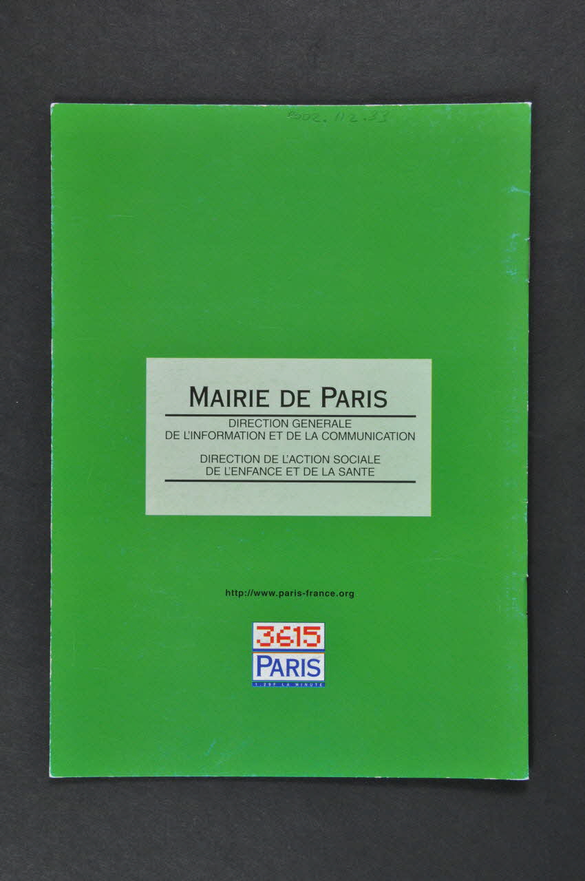 MAIRIE DE PARIS // DIRECTION GENERALE // DE L'INFORMATION ET DE LA COMMUNICATION // DIRECTION DE L'ACTION SOCIALE // DE L'ENFANCE ET DE LA SANTE (Au centre du fond vert en noir), versoDate