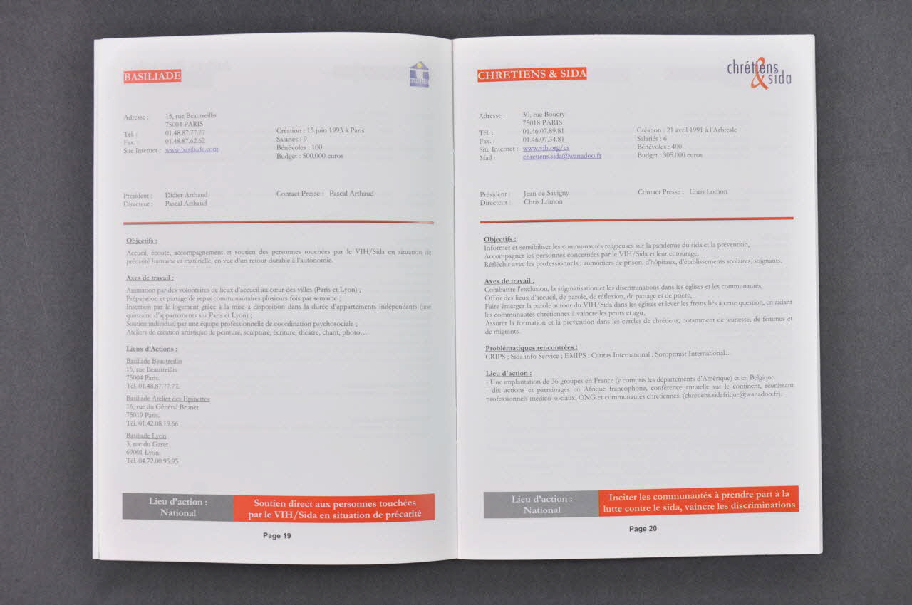 Dos fond blanc, encadrement en noir, impression sur toute la page : (en noir) : "Le sida nous tue." (en rouge) "Le sida tue nos enfants, tue nos amis, tue nos maris, tue nos femmes, tue nos amants, tue nos parents, tue nos voisins, tue nos cousins, tue nos créateurs, tue nos soeurs, tue nos frères, tue nos proches, tue nos jeunes, tue nos champions, tue nos malades, tue nos semblables, tue nos frères de coeur, tue nos frères de couleur, tue nos maîtresses, tue nos filles, tue nos fils, tue nos orphelins, tue nos familles." (en noir) "Tuons le sida". En bas, à gauche, sur bandeau noir, en gris, appel à don à Ensemble contre le sida. A droite, logo de Sidaction. Intérieur fond blanc, impression en noir. Une page par association. En haut, à gauche, en blanc sur bandeau rouge, nom de l'association. En dessous : coordonnées de l'association et, sépara par un trait rouge : Objectifs, axe de travail, partenariats. En bas, en blanc sur petit bandeau gris : Lieu d'action et sur petit bandeau rouge : mots clef (reproduits sur la présente fiche) Sommaire - Présentation de l'UNALS - Actions Traitements (National) : "Etre acteur de son traitement, mieux informé, mieux soigné" - ACTIS (Loire et Haute-Loire) : "Tout cela s'appuie sur une démarche d'approche communautaire" - Aiutu Corsu (Corse du Sud) : "Continuer à diffuser des messages de prévention et apporter aide et soutien aux personnes touchées" - AJAC-SIP (Alpes Maritimes) : "Hébergement, information, prévention, soutien" - ALIS 36 (Indre) : "Héberger, prévenir, accompagner, orienter, écouter, accueillir, informer" - ALTERNATHIV (Ile de France) : "Accueillir, soutenir, accompagner" - ALS (Lyon et Rhône) : "Accueil, information, préventikon, soutien" - ARAP-RUBIS (Gard) : "Actions médico-sociales avec les personnes prostituées" - ARBOR - SOS Habitat et Soins (Aude) : "Lutte contre le sida - Lutte contre l'exclusion" - ARCAT - Groupe SOS (National) : "Accompagner, orienter, prévenir, informer" - ASUD d'Hérault (Hérault) : "Auto-support et prévention du VIH auprès des usagers de drogue - ASUD National (National) : "Défendre la citoyenneté des usagers de drogues et promouvoir la réduction des risques" - ASUD Nîmes (Nîmes) : "Auto-support et réduction des risques. Eviter les risques, préserver la santé" - Autres Regards (Bouches du Rhône, Vaucluse) :"Prévention VIH, VHC, IST auprès des publics prostitués ou en risques. Accès aux droits pour les soins et éducation à la santé." - Basiliade (National) : "Soutien direct aux personnes touchées par le VIH / Sida en situation de précarité" - Chrétiens et Sida (National) : "Inciter les communautés à prendre part à la lutte contre le sida, vaincre les discriminations" - Combat face au Sida (National) : "Contribuer au débat public" - Couples contre le sida (National) : "Réduction des risques et sexualité, prévention VIH IST, auprès des hétérosexuel(le)s multipartenaires" - CRIPS Ile-de-France (Ile de France) : "Appuyer et relayer les actions de prévention et de lutte contre le sida et la toxicomanie dans le cadre des programmes définis par l'Etat et la région IDF" - CRAES-CRIPS (Rhône-Alpes) : "Lieu de ressource pour les acteurs de terrain en lien avec la prévention et la réduction des risques" - Croix Verte et ruban rouge (National) : "Promotion de la prévention du sida et des toxicomanies par les pharmaciens" - Dessine-moi un mouton (Ile-de-France) : "Préserver l'équilibre de vie de l'enfant dans les familles touchées par le virus du sida" - Diagonale Ile-de-France (Ile de France) : "Prévenir, accompagner, héberger, créer des solidarités" - Envie (Montpellier) : "Une équipe de professionnels et de bénévoles au service des personnes séropositives" - Etudiants contre le sida (Rhône Alpes, National) : "Prévention auprès des jeunes" - HIV 58 (Nièvre) : "Information, prévention, soutien" - IKAMBERE (Seine Saint Denis) : "Prise en charge des femmes atteintes par le VIH/Sida" - La Contremarque (Noisy le Sec) : "Soutien psychologique, qualité de vie, insertion" - Le Kiosque Info Sida (Paris Ile-de-France Diffusion nationale de matériel de prévention) : "Prévention, information, orientation sida, toxicomanie" - Mille Horizons (Ille et Vilaine) : "Formation, information auprès des professionnels, grand public, prise en charge VIH-VHC" - PASTT (Paris / Ile de France) : "Programme communautaire de prévention VIH/IST, hébergement" - Sid'accueil 14 (Basse Normandie) : "Soutien, prévention auprès des jeunes et des moins jeunes" - Sida info Service (National) : "Information, soutien, écoute, orientation" - Sida Quercy (Cahors-Montauban) : "Prévention, accompagnement" - SOS Insertion et alternative (National) : "Insertion professionnelle et sociale de personnes en difficulté" - SOS Drogue International (International) : "Lutte contre la toxicomanie, aide et soins aux usagers, réinsertion, accueil, prise en charge" - SOS Habitat et Soins (National) : "Favoriser l'accès aux soins et au logement aux personnes en situation précaire" - Action : des militants du Nord soutiennent des militants du Sud - Charte des associations de l'UNALS - Statuts