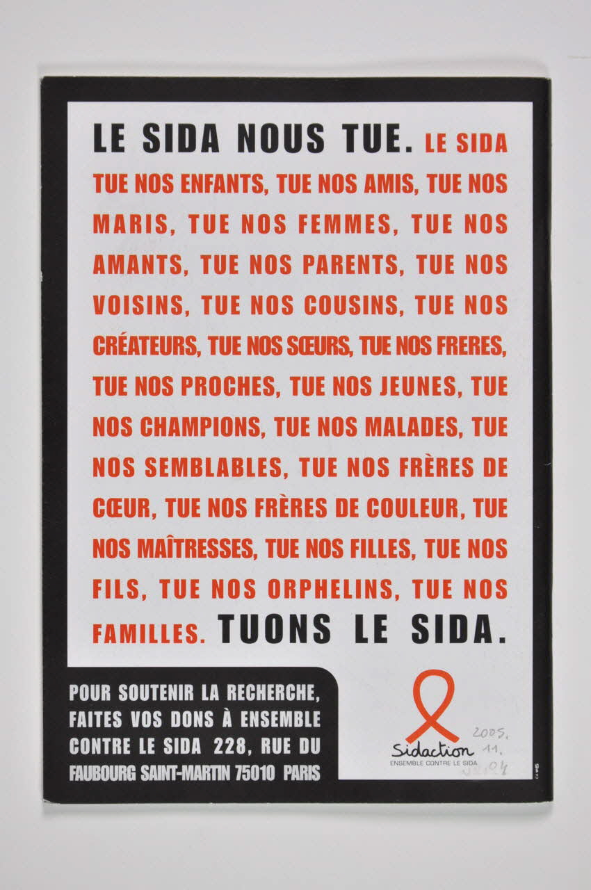 LE SIDA NOUS TUE. LE SIDA TUE NOS ENFANTS, TUE NOS AMIS, TUE NOS MARIS, TUE NOS FEMMES, [...] // TUONS LE SIDA (Le texte est marqué en noir et rouge sur la quatrième de couverture.), sur la couvertureAdresse, numéro
