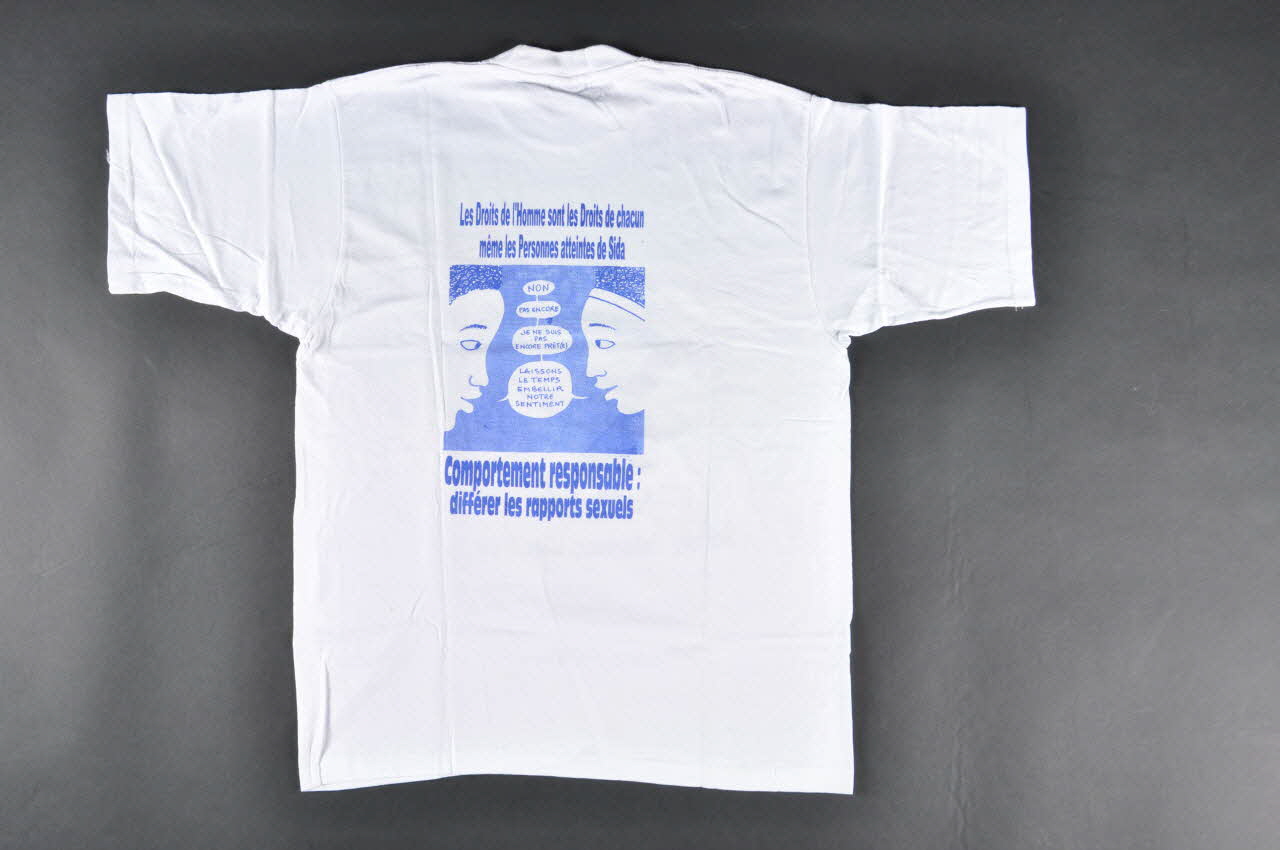 Tee shirt blanc à manches courtes imprimé sur au dos et sur le devant. Devant, un grand point d'interrogation est dessiné comme un graffito. Sur son sommet une inscription. Sur le point à sa base le nom de maladies. Sous le point d'interrogation et en arc de cercle au dessus, des slogans sont imprimés, en lettres bleues sauf la première lettre de chaque mot, en rouge, formant SIDA, en bas. En haut à droite, sur la poitrine, un petit ruban rouge, entouré d'inscriptions. Au dos, des impressions en bleues autour d'une illustration en bleu. Au centre d'un rectangle, une tête de garçon et une tête de fille de profil et un dialogue est inscrit dans des bulles sortant de leur bouche.Inscriptions