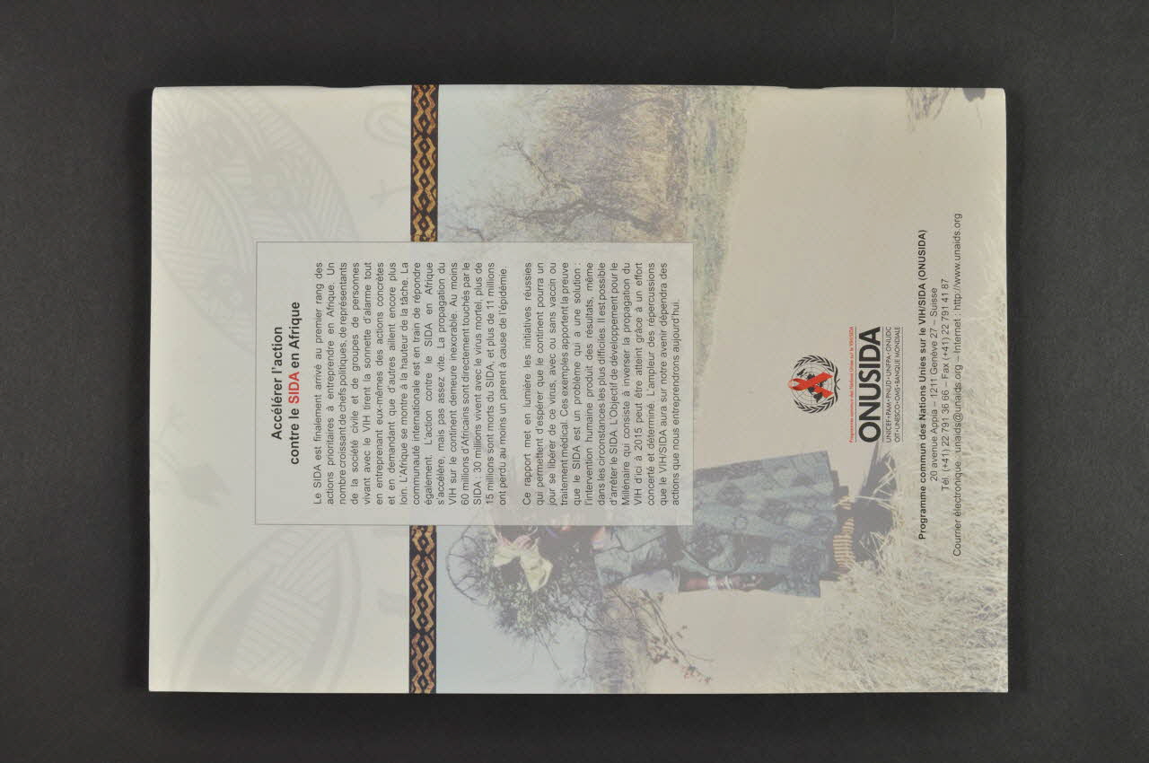 Le dos de la couverture présente une photo en sous impression d'une femme en boubou dans un paysage. Au dessus est imprimé un texte dans un cadre et le logo de l'ONUSIDA se trouve en bas.