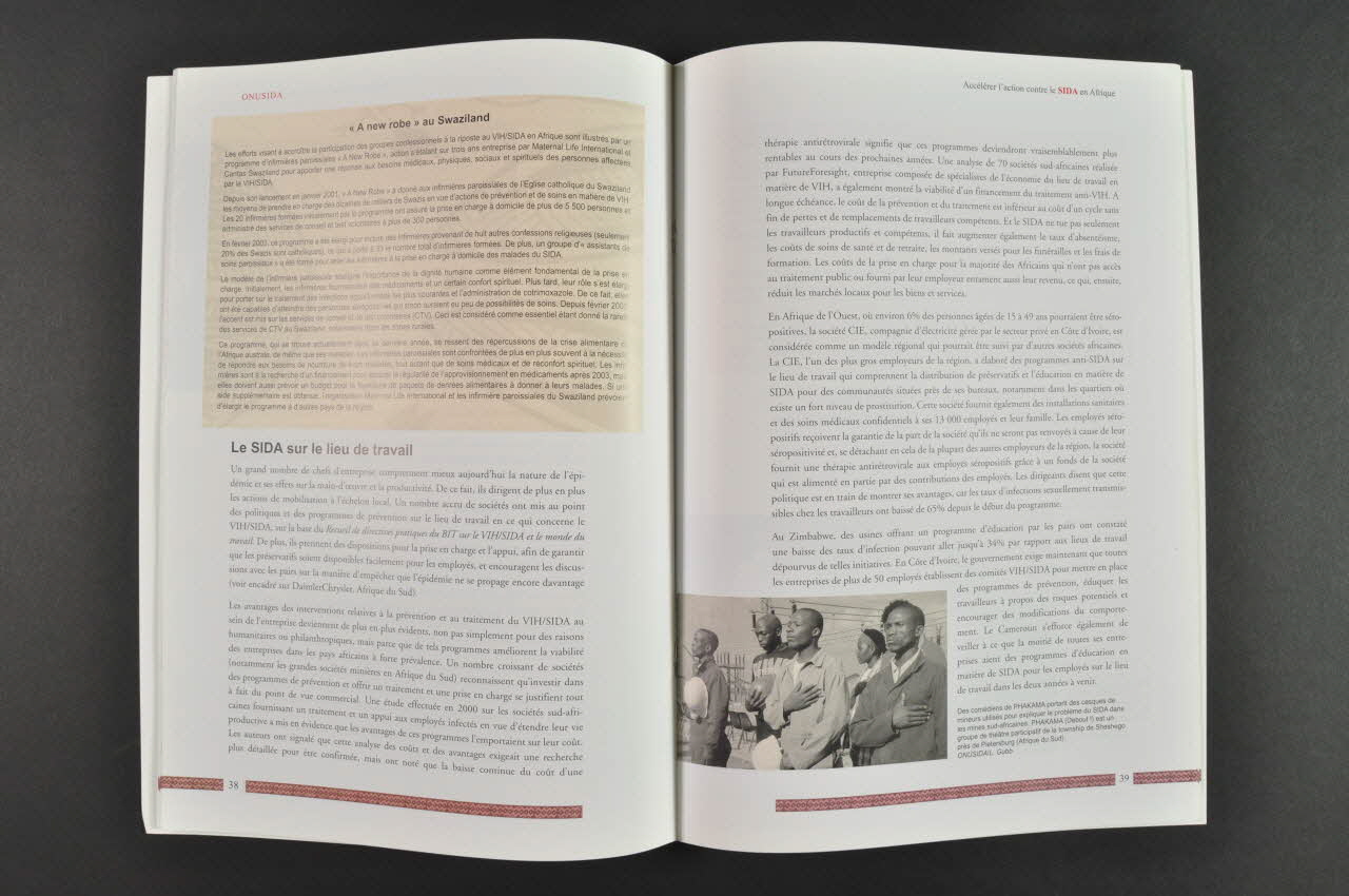 Au dessus, un titre est en noir et rouge, avec un logo ONUSIDA. En sous-impression se trouve des dessins de style african en gris.
