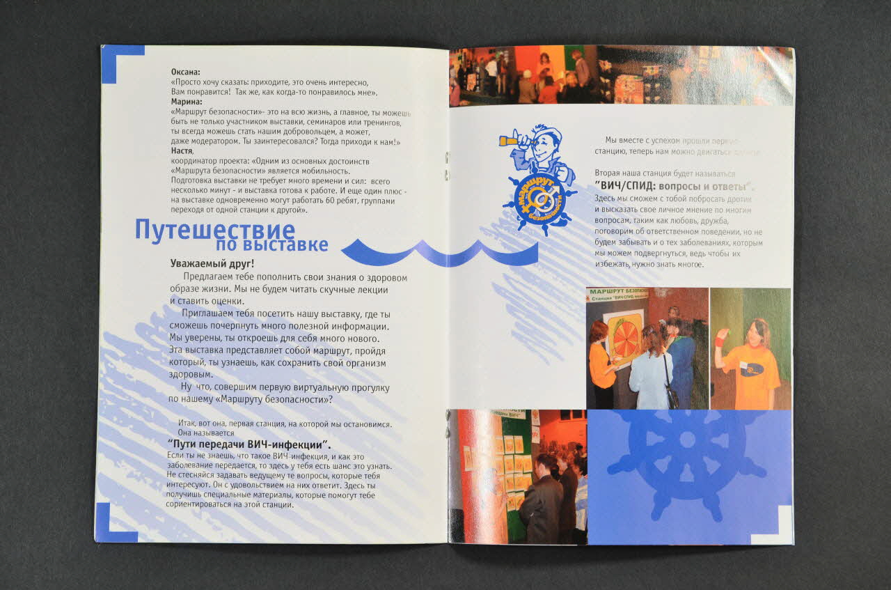 La couverture présente un fond bleu avec, dans la partie supérieure, le dessin en bleu et jaune d'un marin au gouvernail d'un bateau appelé TOMCK regardant à la longue vu. Dans le gouvernail, un logo est imprimé. Ce dernier est placé dans un encadré rectangulaire jaune. En dessous, un bateau est présent. Des nuages sont symbolisés schématiquement par une séries de traits parallèles gris. Dans le bas, un gouvernail est dessiné en blanc ; on ne voit pas le bas. Sur la droite, une bande jaune verticale est imprimée et contient du texte en blanc. Les motifs présents sur le fond bleu se poursuivent dans la bande. L'arrière est bleu ; un logo et du texte sont présents dans le bas. Une ligne blanche est présente verticalement à gauche. La couverture arrière est détachable ; la troisième page de couverture correspond en effet à un bulletin à compléter. L'intérieur comprend du texte imprimé en noir sur blanc. Il s'agit d'une présentation des activités de l'association, et en particulier d'une exposition faite par des jeunes. Les titres sont en couleur (bleu, orange, vert). Les pages présentent des motifs colorés également (traits, ronds, vagues). Le motif de la couverture est répété à six reprises. Des photographies couleurs, de petites dimensions, sont également présentes.Décor