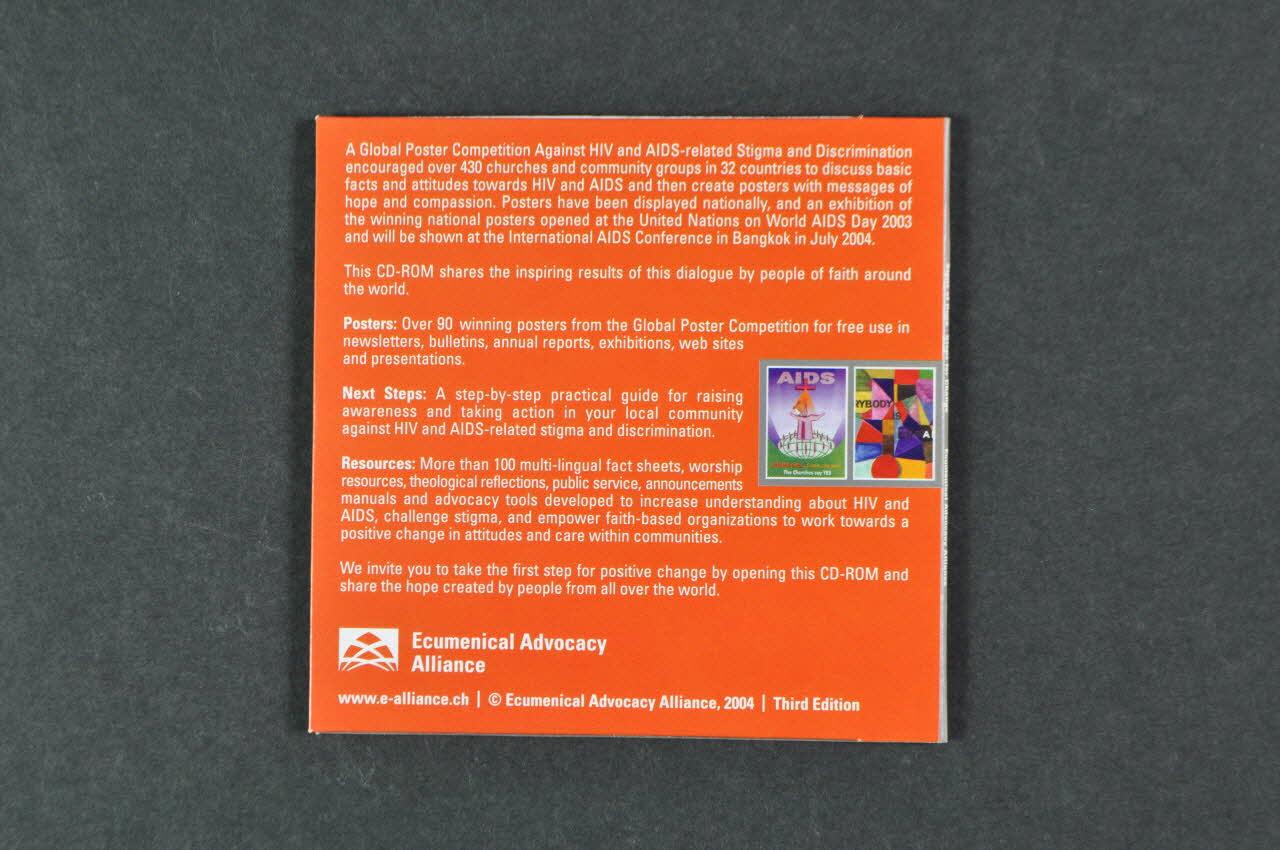 Le recto du Cdrom présente des inscriptions blanches sur un fond orange, avec en partie inférieure un motif plus clair composé de losanges incurvés. La pochette est orange sur l'extérieur et grise sur l'intérieur, avec des textes. La couverture est illustrée d'un bandeau de huit images dont une partielle ; il s'agit de reproductions miniatures d'affiches pour la prévention du sida : ruban rouge, silhouettes, seringues, cactus, etc. Deux autres affiches sont présentes à droite au verso. Contenu du CD : - Photos d'environ 90 affiches gagnantes - Guide de sensibilisation à la stigmatisation et à la discrimination - Documentation en plusieurs langues (plus de 100 documents)Inscriptions