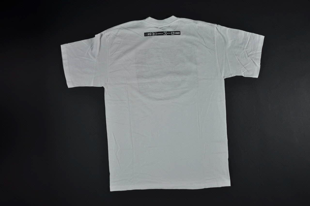 Tee shirt en toile de coton blanc, à manches courtes et encolure ronde, orné sur l'avant d'une large illustration : dans un rectangle encadré de noir, sur fond bleu avec petits traits noirs et nuages gris un personnage en tee shirt rayé rose et vert, jean et baskets, avec des ailes blanches, volant au milieu de petits rubans rouges. Dans le haut du dos figurent les logos des chaînes de télévision TF1, France 2, France 3, Canal +, 5, Arte, M6, RFO, en bande sur bandeau noir.Décor