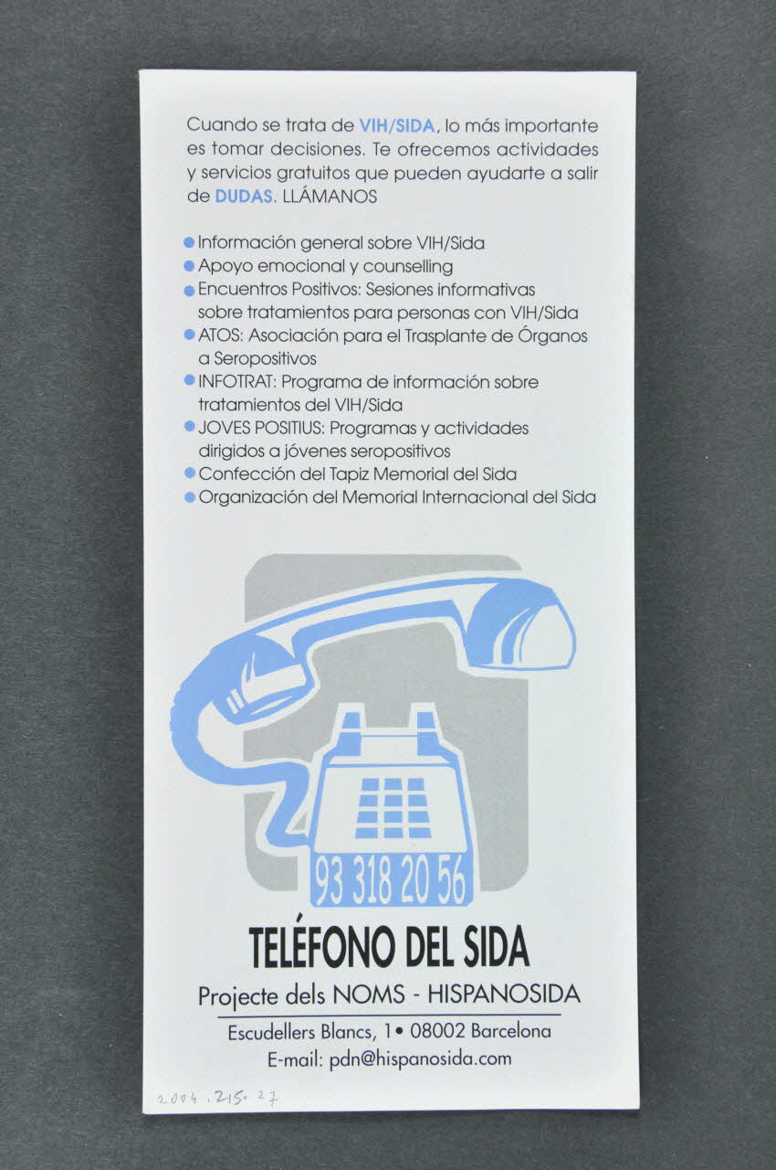 TELEFONO DEL SIDA // Projecte desl NOMS - HISPANOSIDA // Escudellers Blancs, 1.08002 Barcelona // E-mail: pdn@hispanosida.com (en bas), versoSlogan