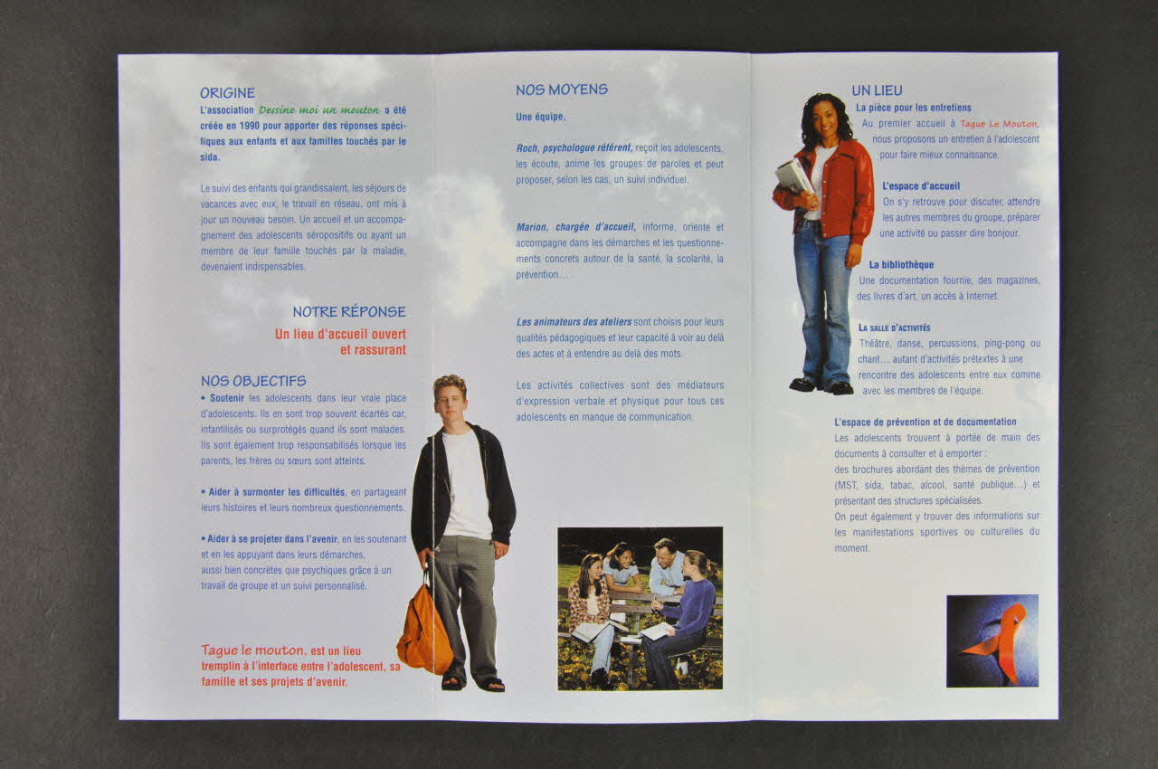 La couverture présente un fond gris avec en sous-impression un motif mutlicolore. Le même motif est présent en surimpression colorée, au centre. Un titre blanc, sur trois lignes, figure au milieu. Sur la partie inférieure, est présent un texte en bleu et vert, avec en partie inférieure, le nom de l'association et un mouton blanc à contours verts. Le verso présente en son centre, le même motif coloré, mais en plus petit. Le reste de la page est blanc avec des inscriptions vertes et noires sur la partie inférieure. A l'intérieur, figurent des textes en bleu et rouge sur un fond représentant un ciel légèrement nuageux. Trois photos d'adolescents et une photo du ruban rouge illustrent les propos. Le volet de rabat, presente un fond blanc cassé, avec en sous impression dans la partie inférieure, la terre. Un titre est inscrit en rouge sur la partie supérieure et plusieurs textes bleus sont présents à la suite. .2 : Feuillet présentant sur une face, le même motif dessiné que celui présent sur le recto et le verso, avec dans la partie inférieure le nom de l'association et un mouton dessiné. L'autre face s'avère être un bulletin de souscription.Inscriptions