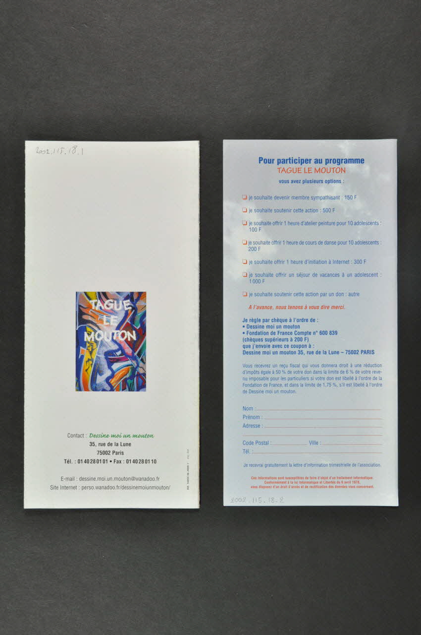 TAGUE // LE // MOUTON (au centre du motif dessiné, en blanc), rectoORIGINE // NOTRE REPONSE // NOS OBJECTIFS // NOS MOYENS // UN LIEU (sur l'intérieur du dépliant)Pour participer au programme // TAGUE LE MOUTON (du bulletin de souscription)UNTRAVAIL DE RESEAU, // inter institutionnel et inter associatif (en rouge, sur le dessus du volet de rabat)Nom d'association