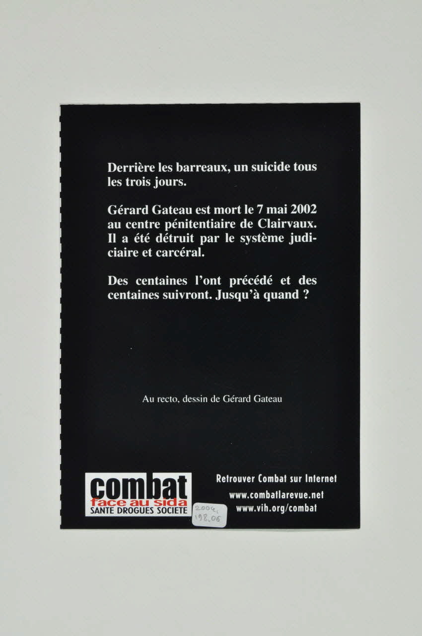 Derrière les barreaux, un suicide tous // les trois jours. // // Gérard Gateau est mort le 7 mai 2002 // au Centre Pénitentiaire de Clairvaux. // Il a été détruit par le système judi- // ciaire et carcéral. // // Des centaines l'ont précédé et des // centaines suivront. Jusqu'à quand ?, versoDécor