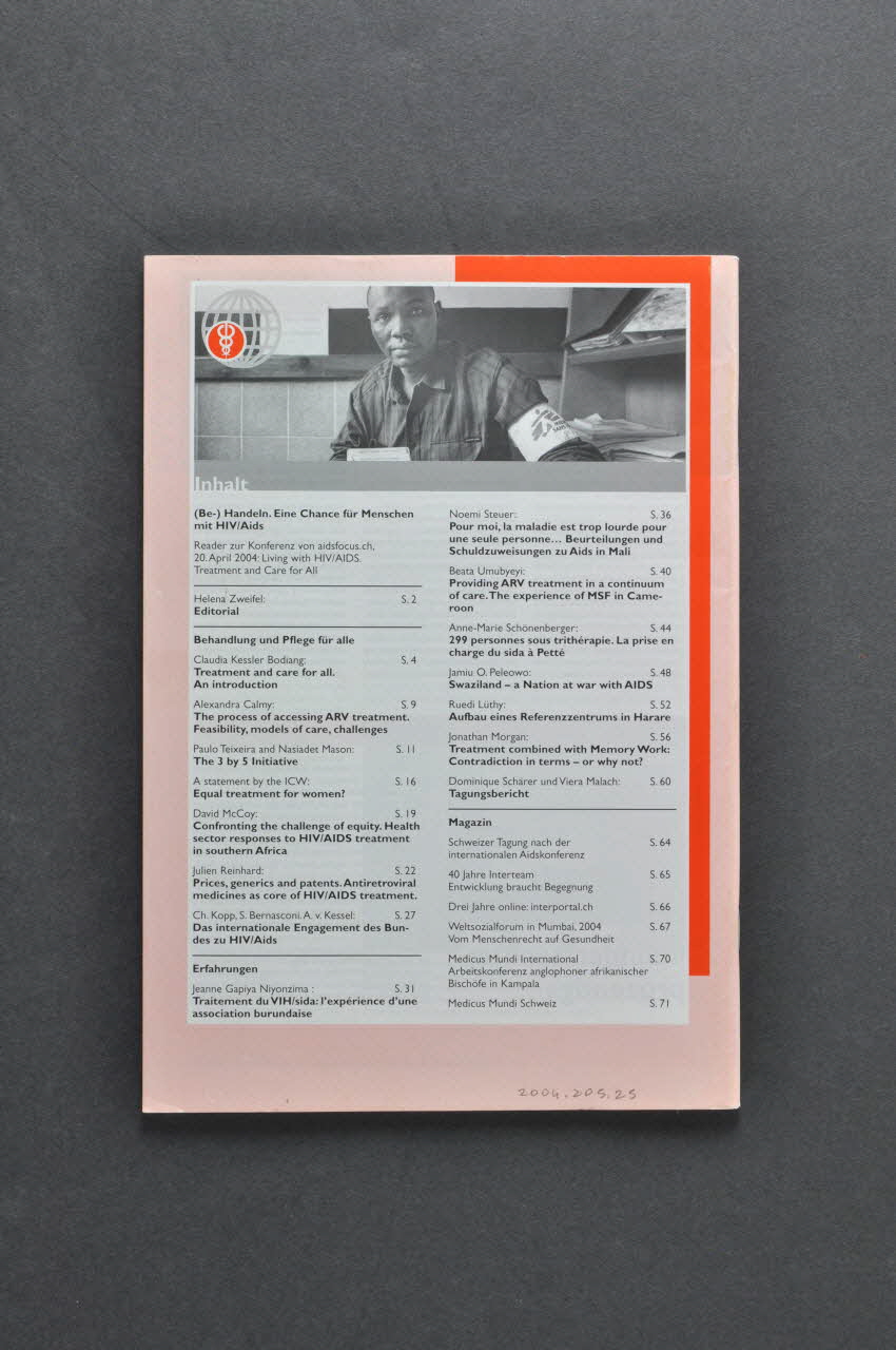 p. 2 Helena Zweifel : Editorial, Be-)Handeln. Eine Chance für Menschen mit HIV/Aids (?Une chance pour les personnes vivant avec le VIH/sida) // p. 4 Claudia Kessler Bodiang : Treatment and care for all : an introduction // p. 9 Alexandra Calmy : The process of accessing ARV treatment. Feasibility, models of care, challenges // p.11 Paulo Teixeira & Nasiadet Mason : The 3 by 5 initiative // p.16 A statement by the ICW : Equal treatment for women ? // p.19 David Mc Coy : Confronting the challenge f equity. Health sector responses to HIV/AIDS treatment in South Africa // p.22 Julien Reinhard : Prices, generics and patents. Antiretroviral medicines as core of HIV/AIDS treatment // p. 27 Ch.Kopp, S.Bernasconi, A.v Kessel : Das international Engagement des Bundes zu HIV/Aids // p. 31 Jeanne Gapiya Niyonzima : Traitement du VIH/sida : l'expérience d'une association burundaise // p. 36 Noemi Steuer : Pour moi, la maladie est trop lourde pour une seule personne... Beurteilungen und Schuldzweisungen zu Aids in Mali // p. 40 Beata Umubyeyi : Providing ARV treatement in a continuum of care. The experience of MSF in Cameroon // p. 44 Anne-Marie Schönenberger : 299 personnes sous trithérapie. La prise en charge du sida à Petté. // p. 48 Jamiu O. Peleowo : Swaziland - a Nation at war with AIDS // p. 52 Ruedi Lüthy : Aufbau eines Referenzzentrums in Harare // p. 56 Jonathan Morgan : Treatment combined with Memory Work : contradiction in terms - or why not ? (boites mémoire en Ouganda, possibilité de laisser la place au traitement et à l'avenir) // p. 60 Dominique Schärer und Viera Malach : Tagungsbericht // p. 64 Magazin, versoDécor